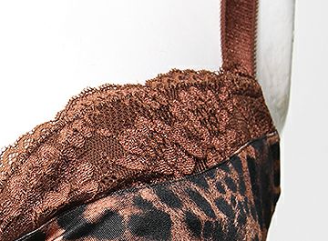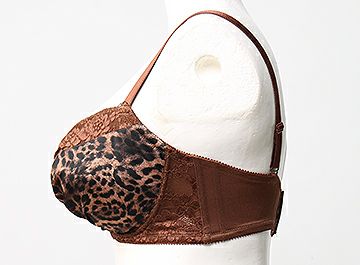 全体を茶色で統一し、カップにはシックな大人気の豹柄プリントにギャザーを入れ、カップ上辺とアンダーには光沢のあるストレッチ花柄レースを使用しています。