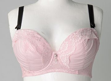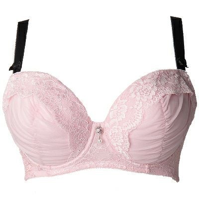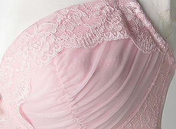 全体をピンクで統一し、カップには柔らかいチュールレースでギャザーをよせカップ上辺と前身には花柄のストレッチレースを施しました。