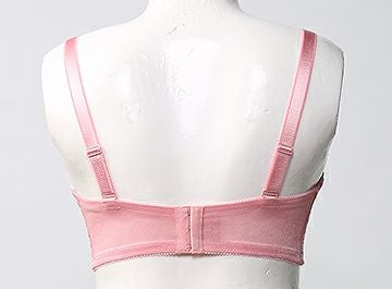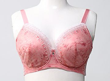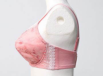 フレンチ・ローズをベースにカップとアンダーはチュールレースの上に同系色の淡いプリントを施し、カップ上辺と脇のボーン位置にはゴージャスな白のケミカルレースを乗せました。