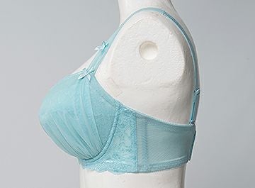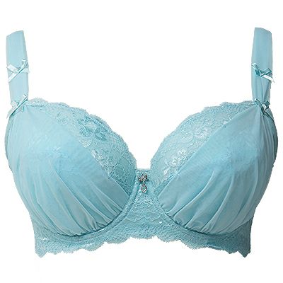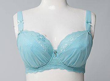 全体をパステル・ブルーで統一しカップとアンダーには光沢のあるコード調のストレッチレースを使用しました。