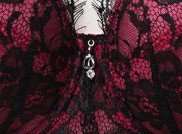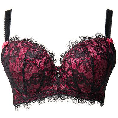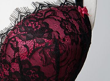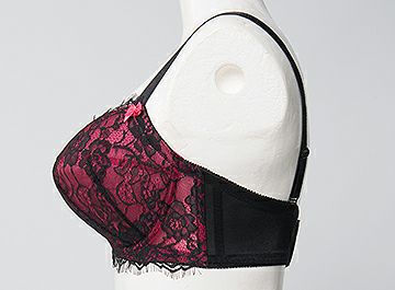 全体を黒で統一しカップとアンダーにはマゼンダ色のサテンを乗せその上に高級なバラ柄のアイラッシュレースを施していますので、繊細の中にも妖艶で大人なブラに仕上がっています。
