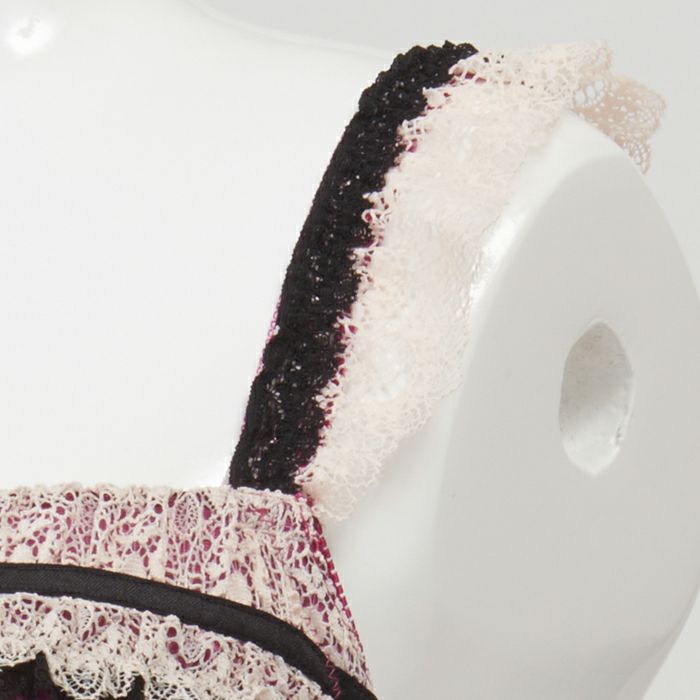 カップ上辺にはペールピンクのストレッチレースとブラックの細幅レースをあしらい、さらにサテンテープを重ねたガーリーなデザイン。