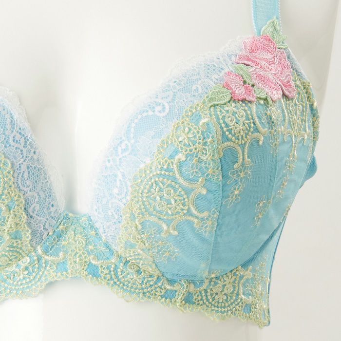 清楚なイメージの水色をベースカラーに、ゴージャスな刺繍を組み合わせた、神聖さを感じさせるランジェリー。
