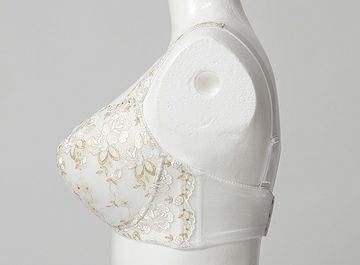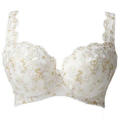 ジュレとは「誓う」という意味。全体をWhite Xmasのイメージの白で統一し、カップ、カップ台下、ストラップには 清楚でゴージャスなオフの花柄とその周りを金糸のコード調の花がアレンジしてありますので、 Xmasにはピッタリの豪華で華やかなブラになっています。
