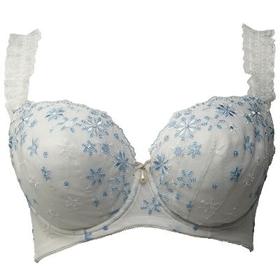 白をベースにカップと前身アンダーには儚げな淡いブルーと白で雪の結晶をイメージしたレースを施しホワイトクリスマスを演出しました。