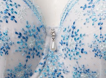 全体を白で統一しカップとアンダーには水玉のフロッキーレースをベースにクリスマス月にちなんで青や水色のコントラストが素敵に映える雪の結晶のレースをふんだんに使用し、カップ下にギャザーを施しました。