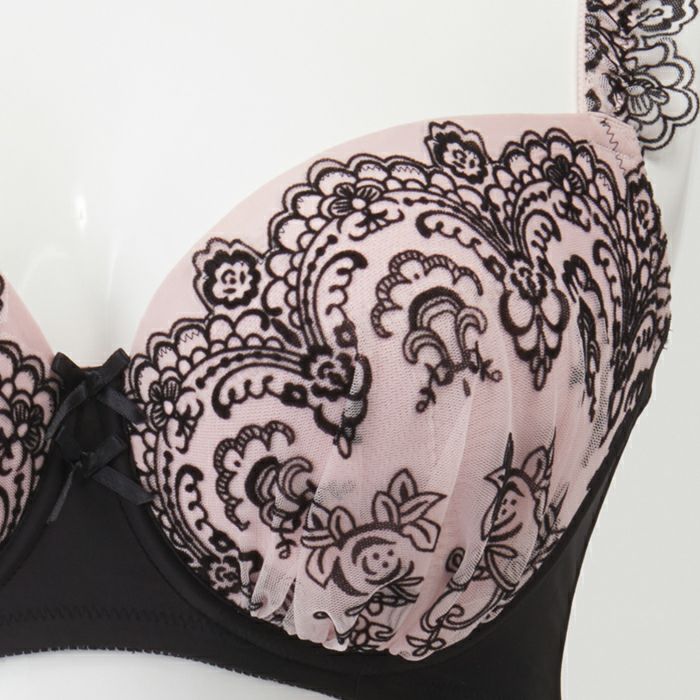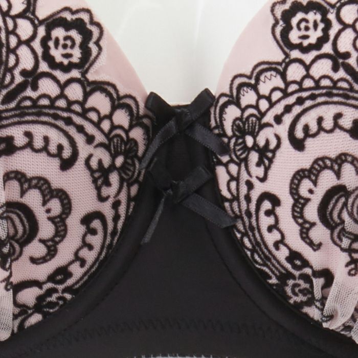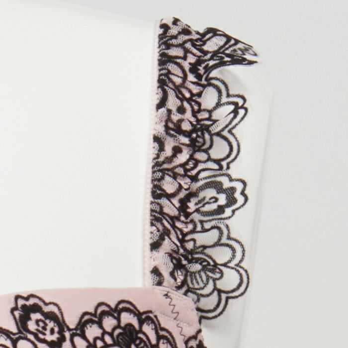 カップはフロッキーレースを使ったギャザーデザイン、ストラップにもフリルをあしらい、スイートなデザインに仕上げました。