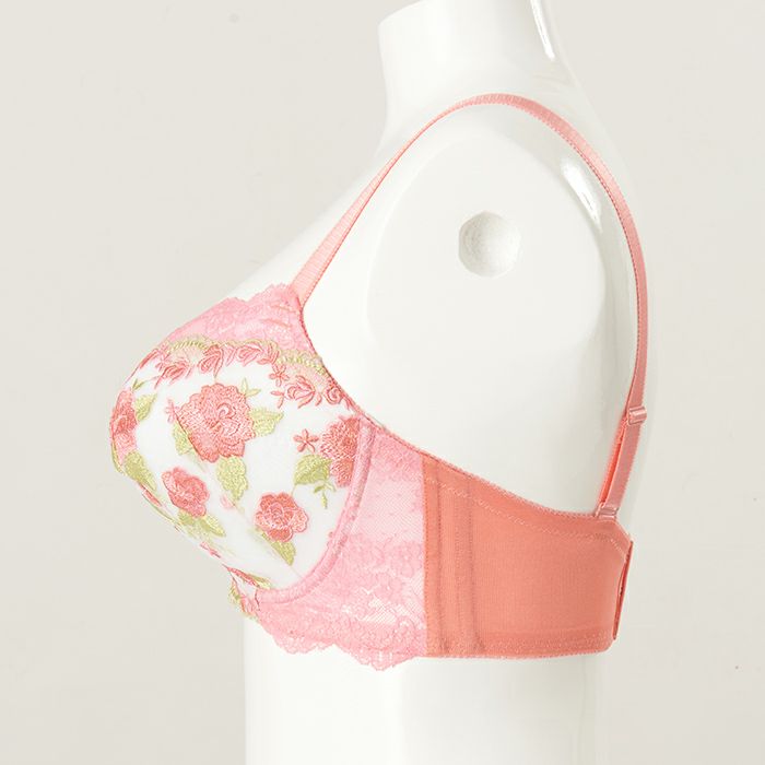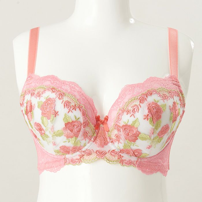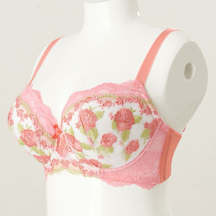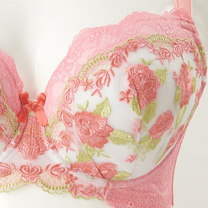 サーモンピンクとローズピンクの刺繍糸で美しい花模様を表現したエンブレースは、リーフグリーンの組み合わせが爽やかさをプラスします。