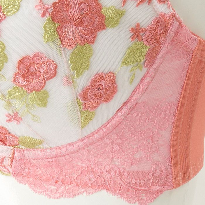 ピンクの色づかいと散りばめられた花柄がフェミニンな印象のランジェリー。