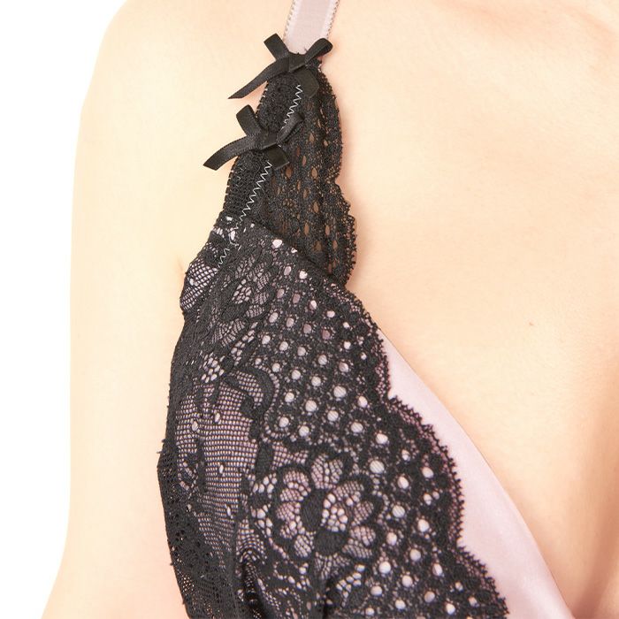 程よい光沢のあるトリコット素材の上から、ブラックのストレッチレースを重ねたセクシーなデザイン。ストラップまであしらったレースがデコルテを美しく魅せます。
