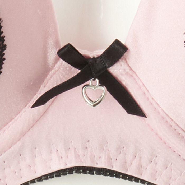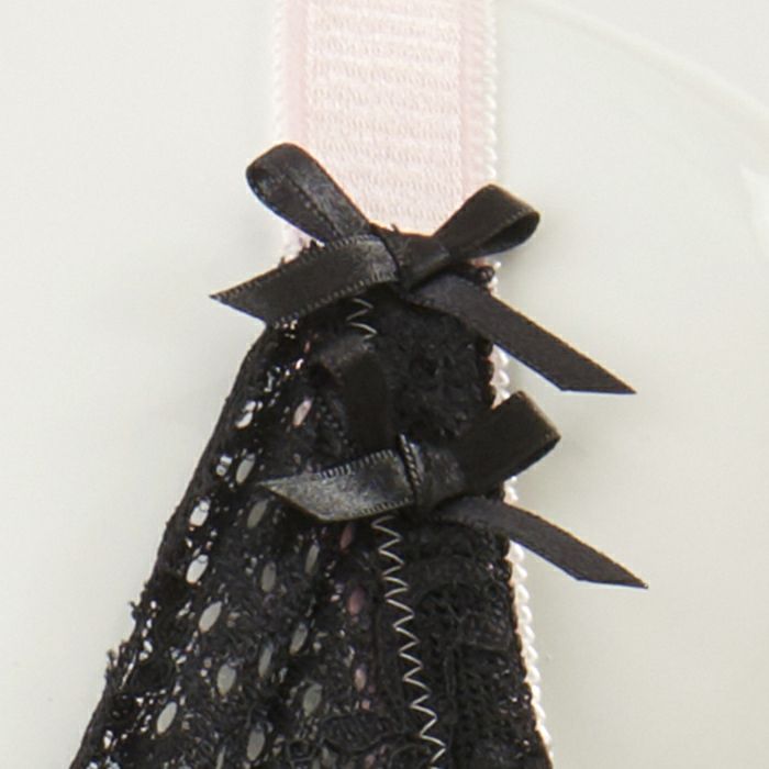 カップのギャザー仕様や、前中心とストラップに飾った小ぶりのサテンリボンが、繊細で可愛い印象をプラス。