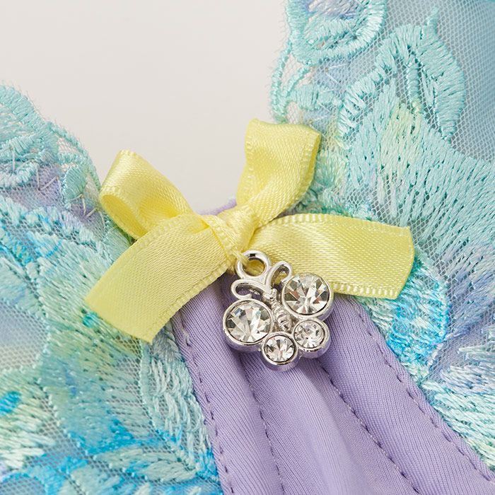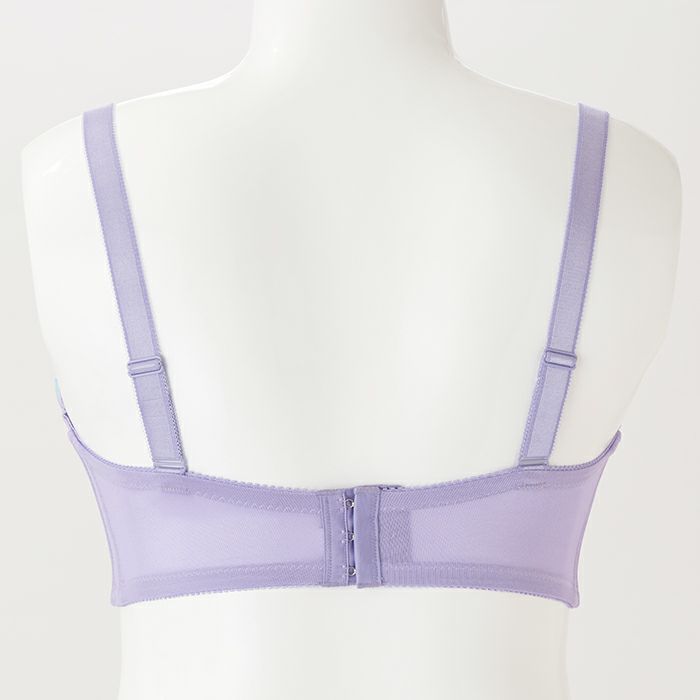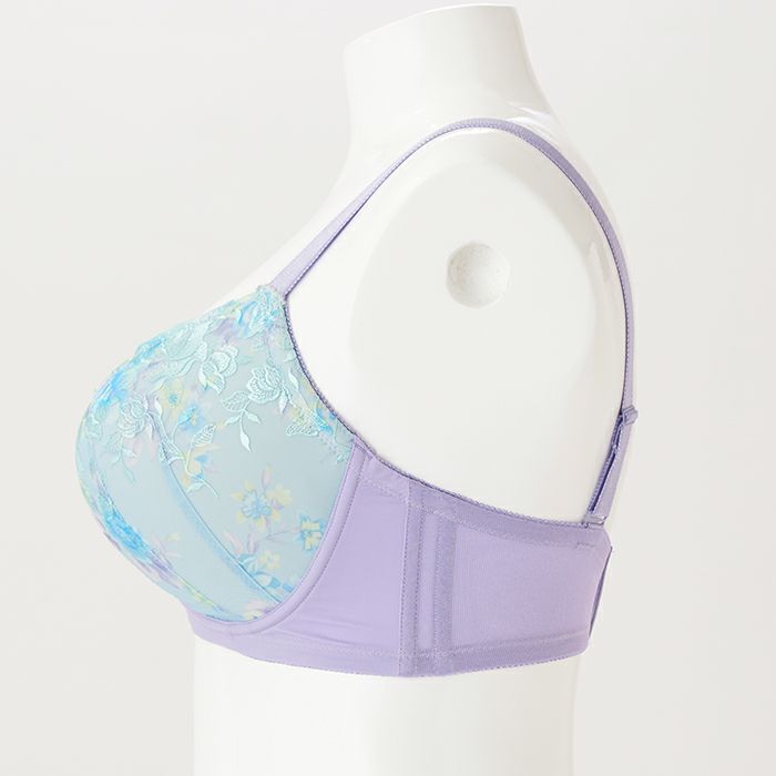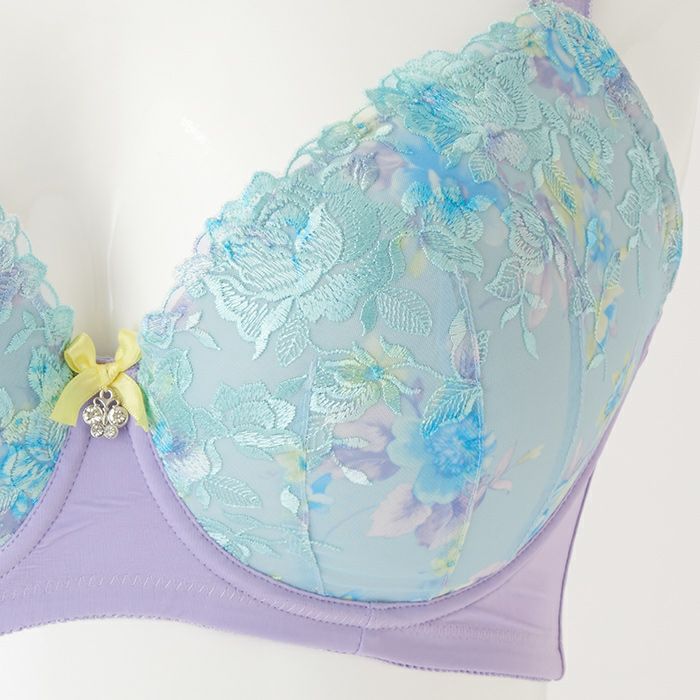 淡いプリント柄と水色の刺繍糸が爽やかな印象 アウターに響きにくいシームレスタイプ&バストをからだに密着させ小さく見せる「モールドブラ丸胸タイプ」 爽やかなカラーリングのプリントと刺繍が印象的なランジェリー。 カップには淡いプリントのチュール素材に水色の花模様をあしらった刺繍レースを重ねました。 ブルー系のレースとラベンダーのベースカラーの組み合わせで、スッキリと魅せつつフェミニンなデザインにまとめました。 前中心にはイエローのサテンリボンと、蝶モチーフのクリスタルを飾りました。 ※プリント柄は、商品によって柄の見え方が違う場合がございますため、ご了承ください。