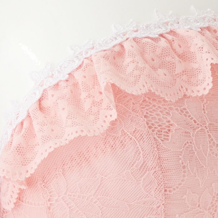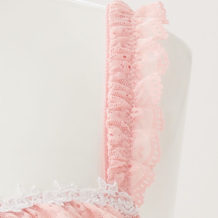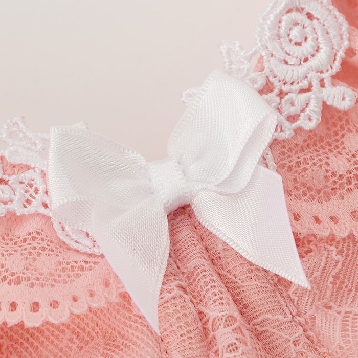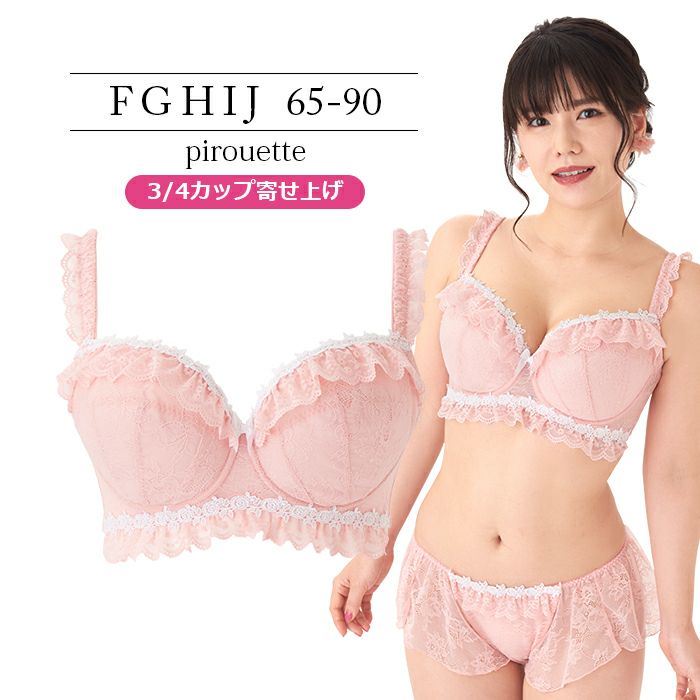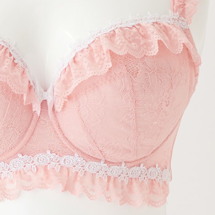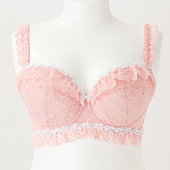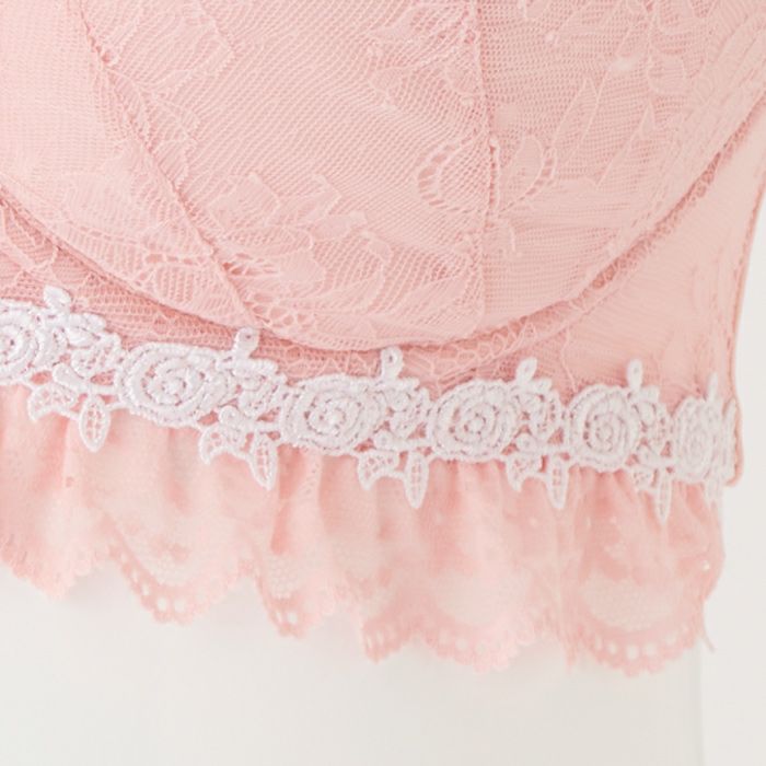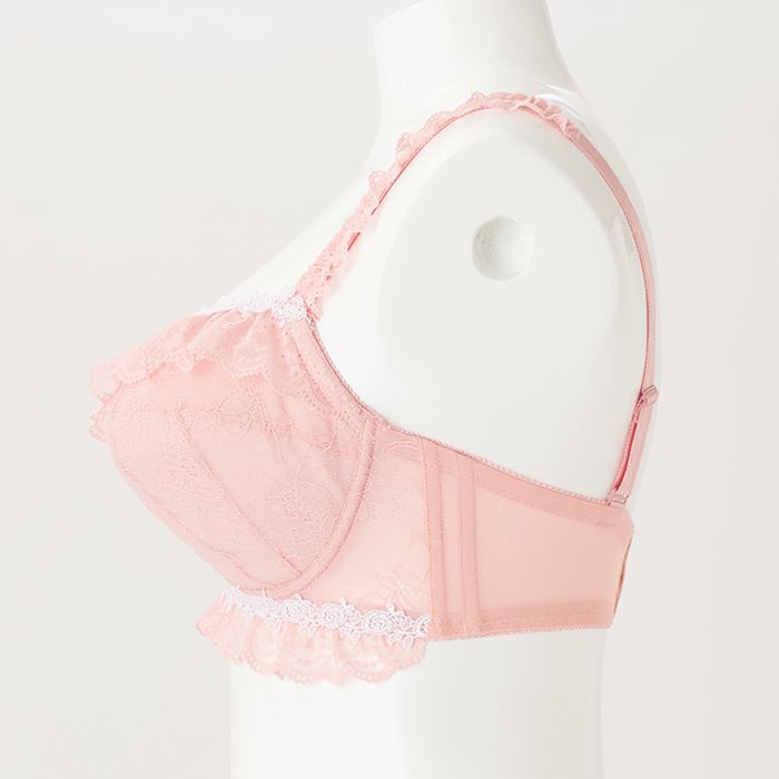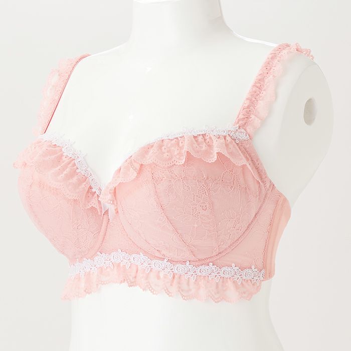 ピンクのレースフリルがSweetなランジェリー 大きいバストをしっかりと支え、バストを寄せて上げて脇もスッキリ、 サポート力の強い人気の「寄せ上げタイプ」のブラ。 パステルピンクのレースデザインがスイートな印象のランジェリー。 カップと前身には広幅のレースを重ね、カップ上辺とアンダー、ストラップにはストレッチレースのフリルをあしらいました。 さらにカップの上辺とアンダーにはホワイトのケミカルレースを乗せ、ロマンティックに仕上げました。 前中心にはホワイトのサテンリボンを飾りました。