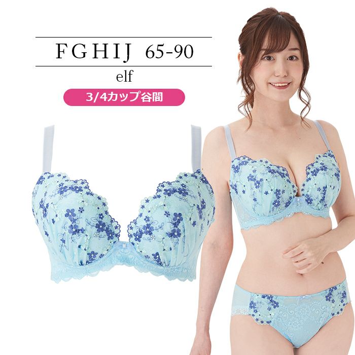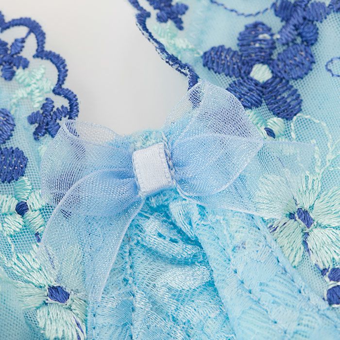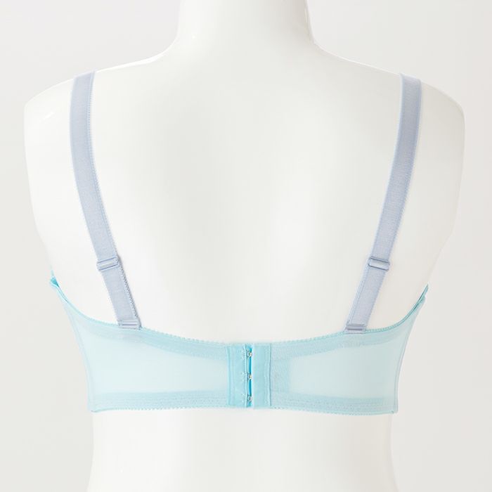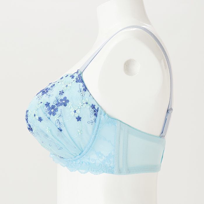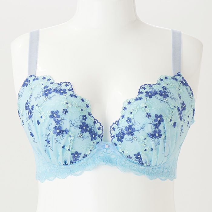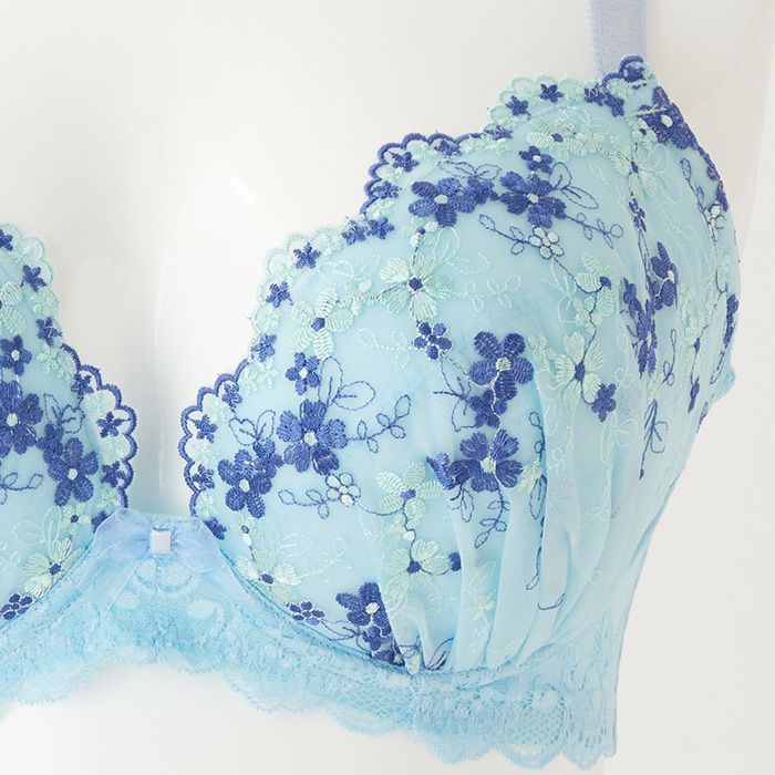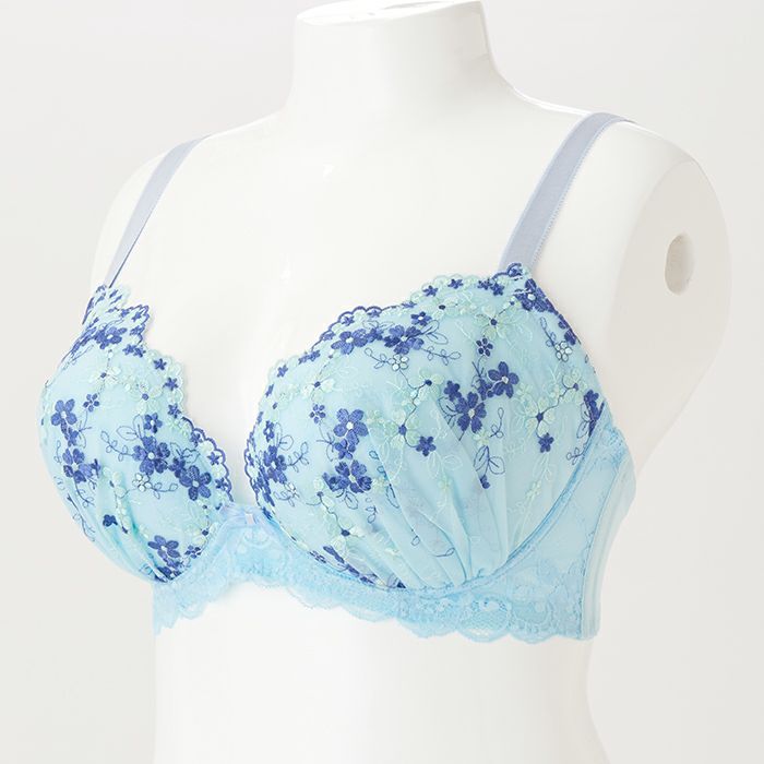 青い小花を散りばめたフレッシュなデザイン 大きな胸の谷間をより美しく魅せる、前中心の低い谷間タイプのブラ。 フレッシュなカラーでまとめた清楚な印象のランジェリー。 カップにはブルーが映える小花柄の刺繍レースを重ね、前身には水色のストレッチレースを使用しました。 前中心にはオーガンジーリボンを飾りました。 デイリーからオシャレな気分の日まで使いやすく、飽きのこないデザインです。