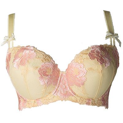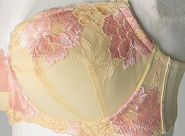 全体を黄色で統一し、カップと前身アンダーには大きい淡いピンクの花がブラジャーを引き立てます。