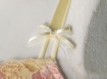 ストラップにはマカロニテープを施し、テープの上部にはレースとサテンの2種類のリボンを両側に使用。