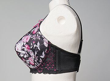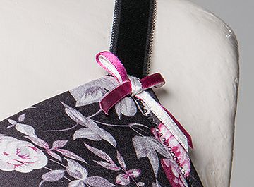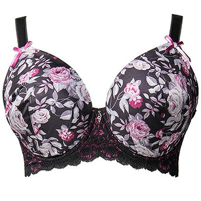 全体を黒で統一し、カップには8色使いのエキゾチックなバラ柄プリントを乗せ、ダーツ処理をしていますのでカップはスッキリとしています。