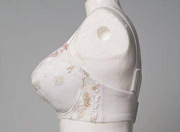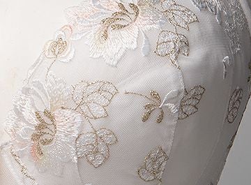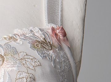 全体を白で統一し、カップとアンダーには5色使いの繊細なエンブレースをダーツ処理で乗せました。