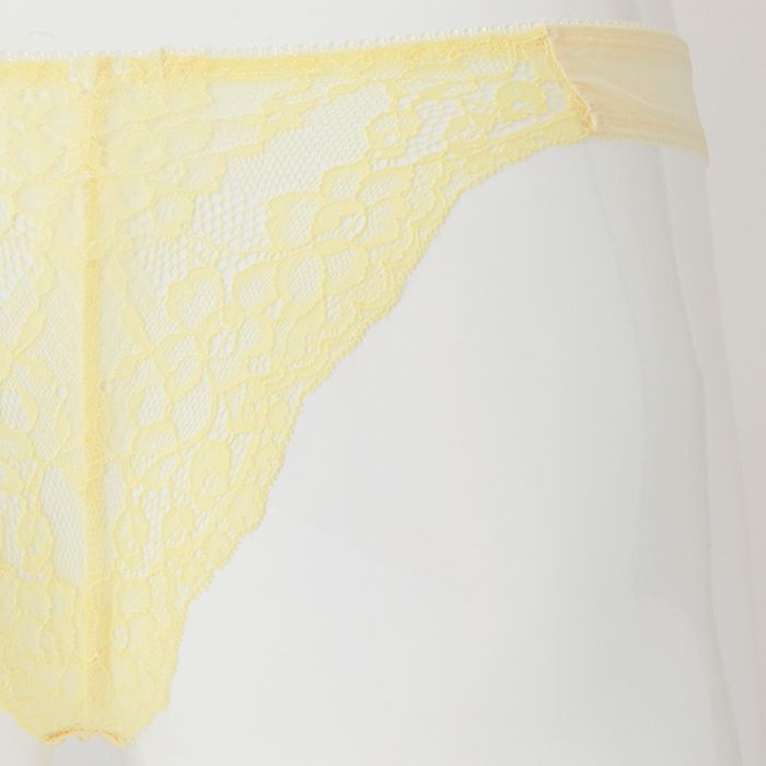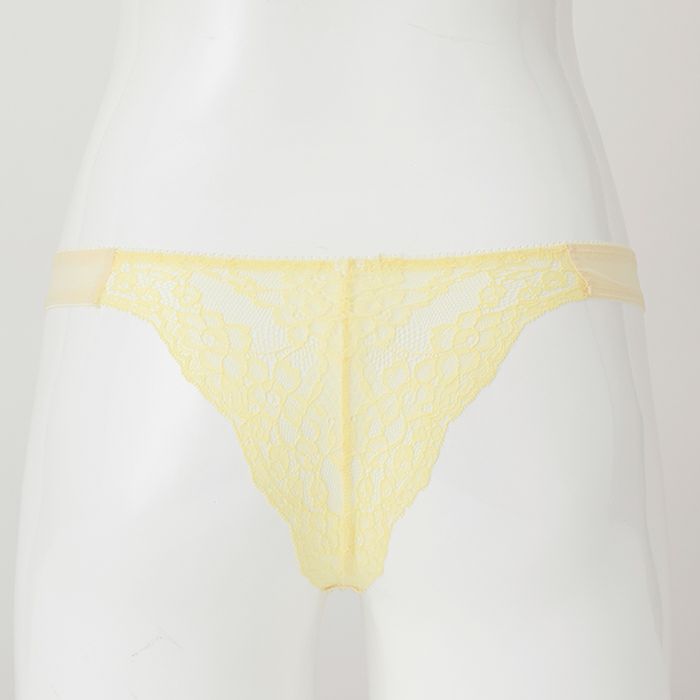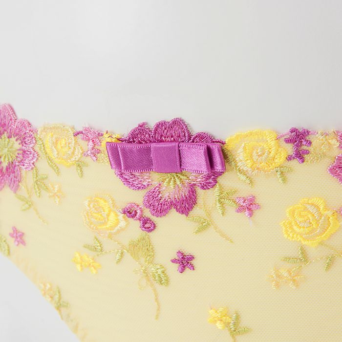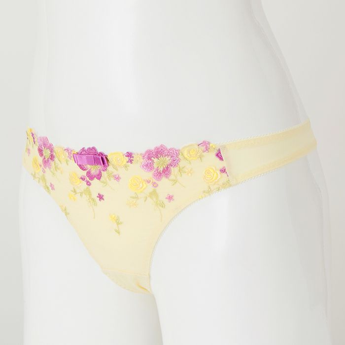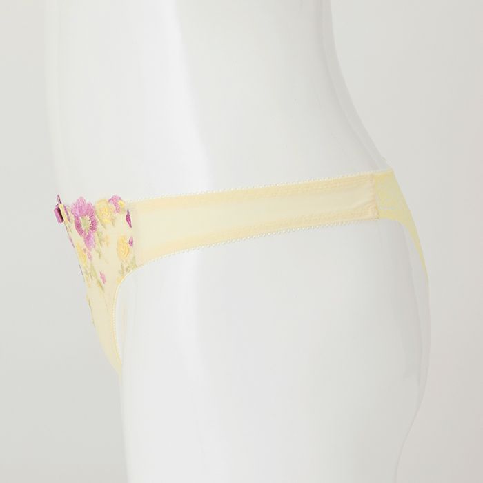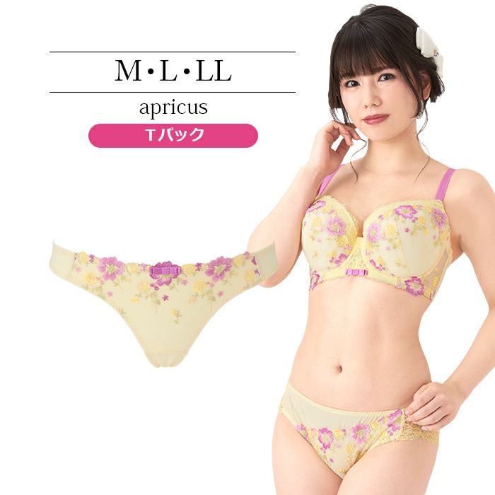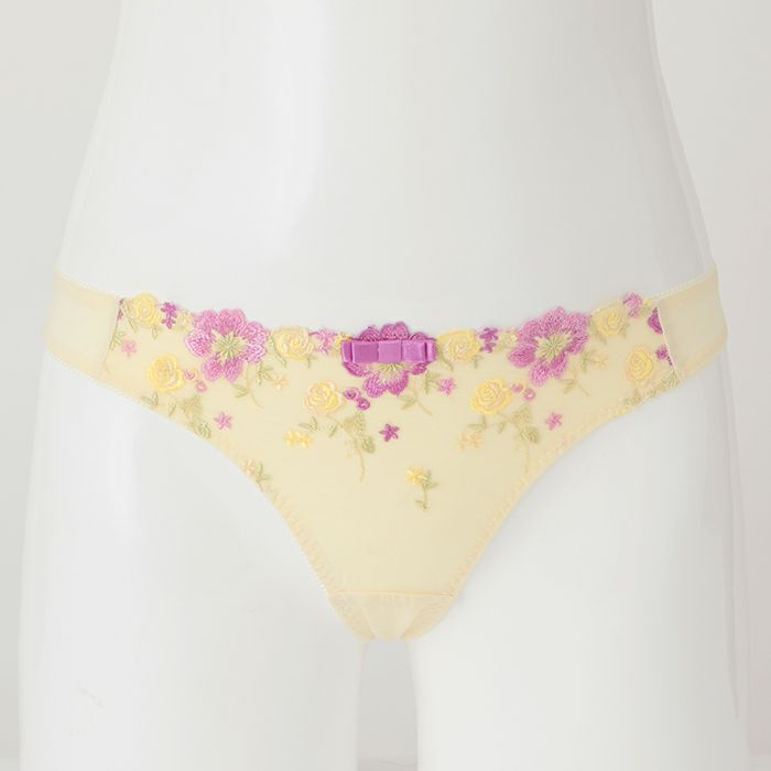 花柄の刺繍をあしらったガーリーなデザイン 大きいバストをしっかりと支え、バストを寄せて上げて脇もスッキリ、 サポート力の強い人気の「寄せ上げタイプ」のブラとお揃いのTバック。 これからの季節にぴったりの、花模様をあしらったランジェリー。 前身には花柄の刺繍レースを重ね、前中心にはフェミニンなパープルのサテンリボンを飾りました。 バックスタイルはクリームイエローのストレッチレースを1枚仕様で切り替え、アウターにひびきにくく仕上げました。