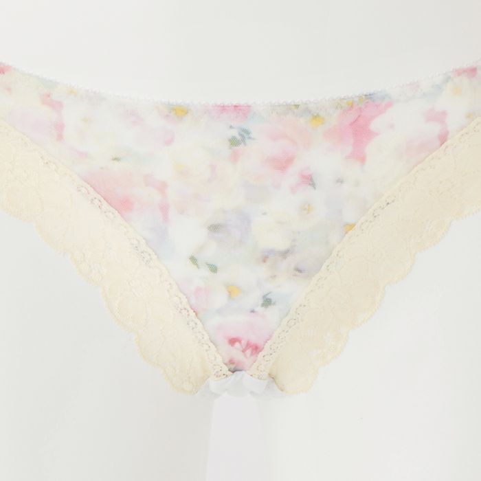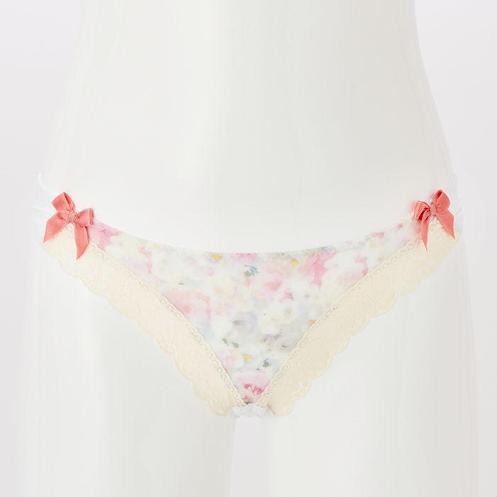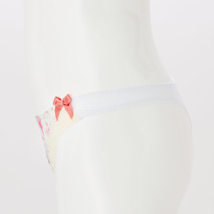 瑞々しい印象のシアープリントで爽やかに アウターに響きにくいモールドタイプ&抜群の寄せ上げ効果で、美しいシルエットを実現する「モールドブラ寄せ上げタイプ」とお揃いのTバック。 ホワイトベースに爽やかなカラーのプリントを組み合わせた透明感溢れるデザイン。 前身はストレッチレースに花柄のチュールプリントを重ね、前足口にはクリーム色の中幅レースをあしらいました。 サイドにはサーモンピンクのサテンリボンを飾りました。 ※プリント柄は、商品によって柄の見え方が違う場合がございますため、ご了承ください。