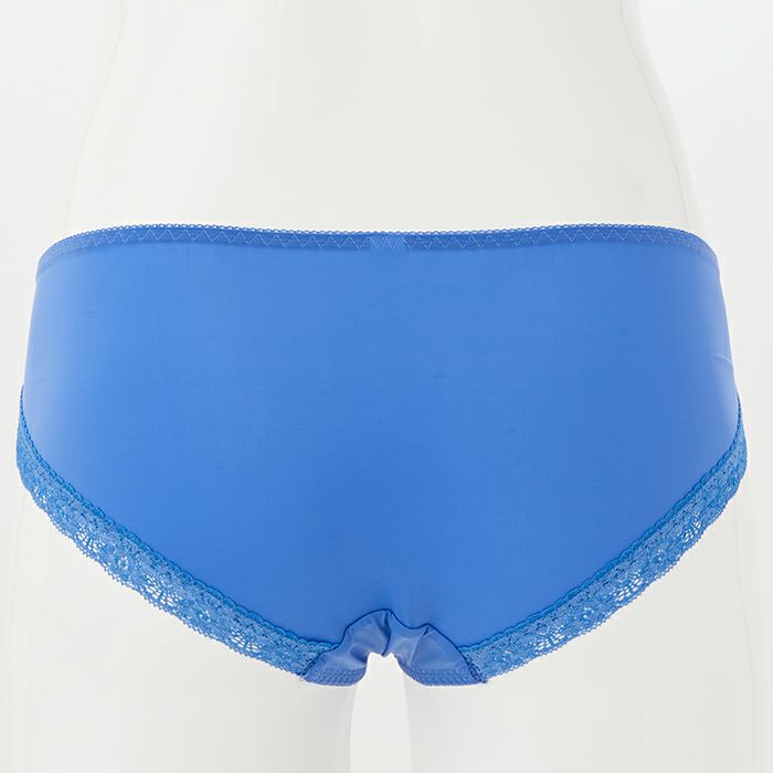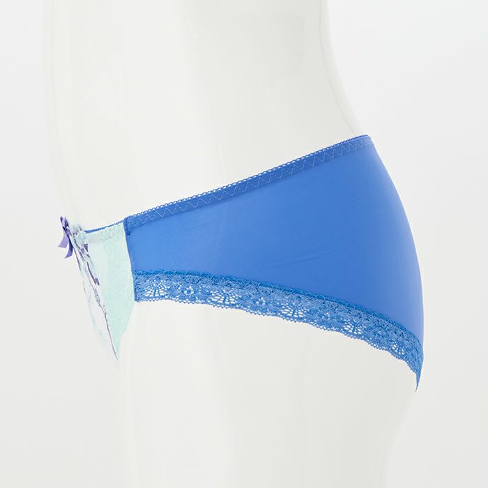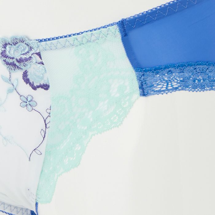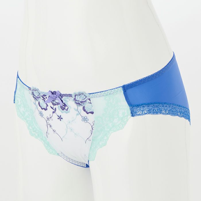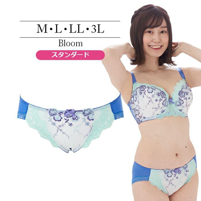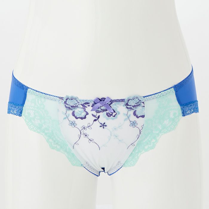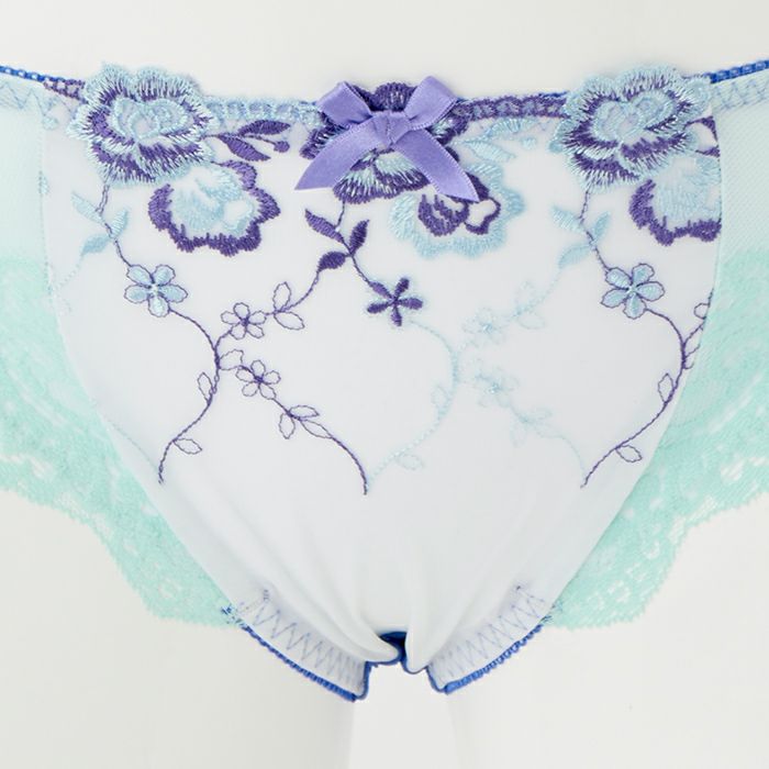 鮮やかな花柄が映える爽やかなカラーリング 大きいバストをしっかりと支え、バストを寄せて上げて脇もスッキリ、 サポート力の強い人気の「寄せ上げタイプ」のブラとお揃いのショーツ。 前身にはパープル×スカイブルーの刺繍糸を使用した花柄レースを重ね、サイドはミントブルーのストレッチレースをあしらいました。 後身をブルーでまとめ、ホワイトのベースカラーとのコントラストを鮮やかに演出します。 前中心にはパープルのサテンリボンを飾り、エレガントに仕上げました。 アウターにひびきにくいように後足口には細幅レースを使用しています。