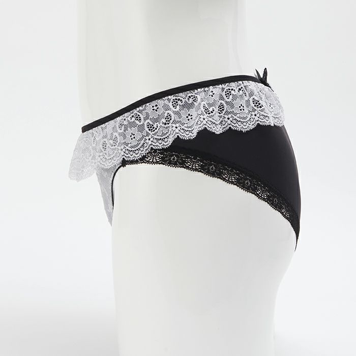 乙女心をくすぐるレースのレイヤード 大きいバストをしっかりと支え、バストを寄せて上げて脇もスッキリ、 サポート力の強い人気の「寄せ上げタイプ」のブラとお揃いのショーツ。 メイド服やゴスロリ風を意識した白黒のランジェリー。 前身には広幅のレースを施し、ウエストフリルにスカラップレースをふんだんに使用。レースのレイヤードが女の子らしさを演出します。 後ろ中心にはブラックの大きめなレースリボンを飾り、さり気ない肌見せのホールをあしらった、印象的なバックスタイルに仕上げました。 アウターに響きにくいように後足口には細幅レースを使用しています。