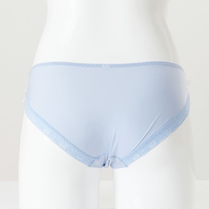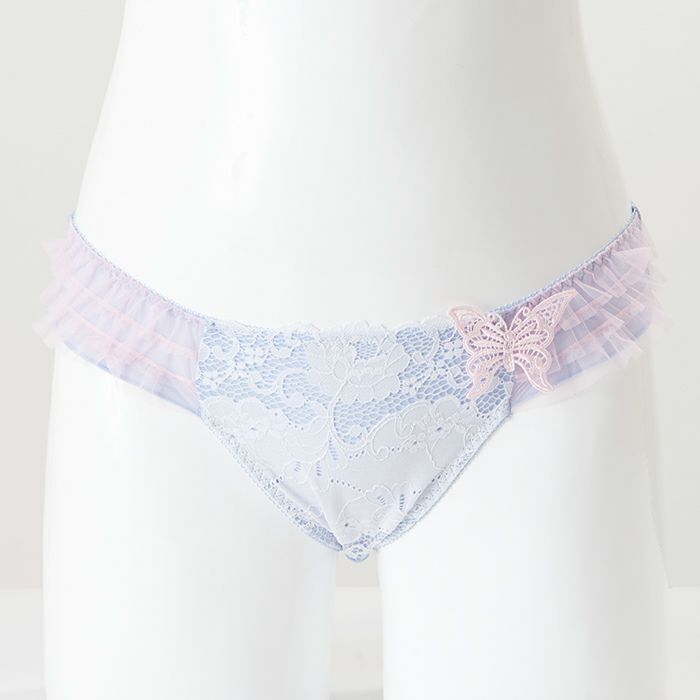 蝶のレースをあしらったSweetなデザイン 大きいバストをしっかりと支え、バストを寄せて上げて脇もスッキリ、 サポート力の強い人気の「寄せ上げタイプ」のブラとお揃いのショーツ。 蝶のケミカルモチーフがポイントの春らしい印象のランジェリー。 前身にはホワイトのストレッチレースを重ねました。 両サイドにはチュールフリルをあしらったスイートなデザインです。 ベースのスカイブルー×チュールと蝶モチーフのベビーピンクの組み合わせで、おしゃれでフェミニンなイメージに仕上げました。 アウターにひびきにくいように後足口には細幅レースを使用しています。
