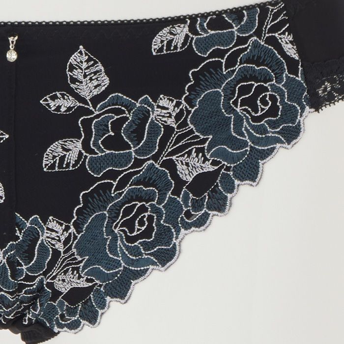 大人っぽく艶やかな印象の刺繍レース バストの存在感を目立たせず、自然な丸みを表現する 「丸胸タイプ」のブラとお揃いのショーツ。 大人の女性にぴったりな艶やかな印象のランジェリー。 前身には、ホワイトとダスキーグレーの刺繍糸を使用したレースを重ね、光の加減によってブルーやグリーンっぽく見える美しい薔薇柄をあしらいました。 前中心にはクリスタルのモチーフを飾りました。 アウターにひびきにくいように後足口には細幅レースを使用しています。
