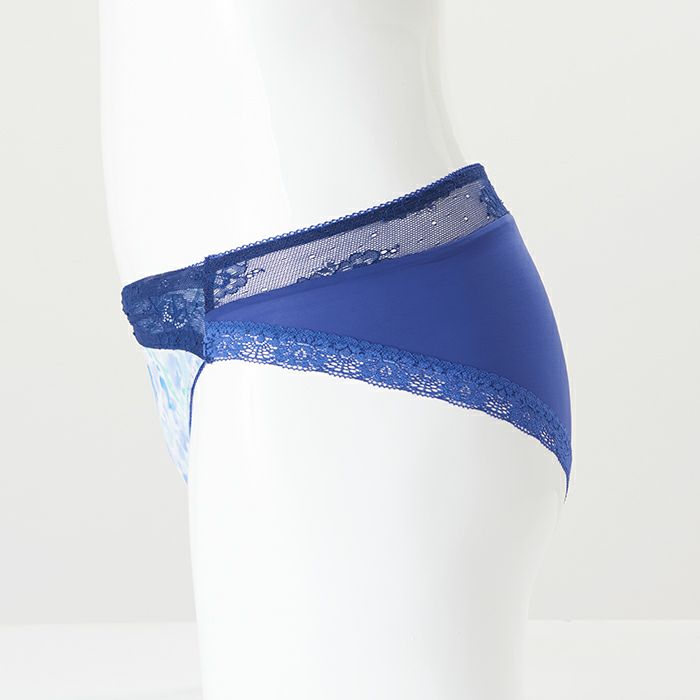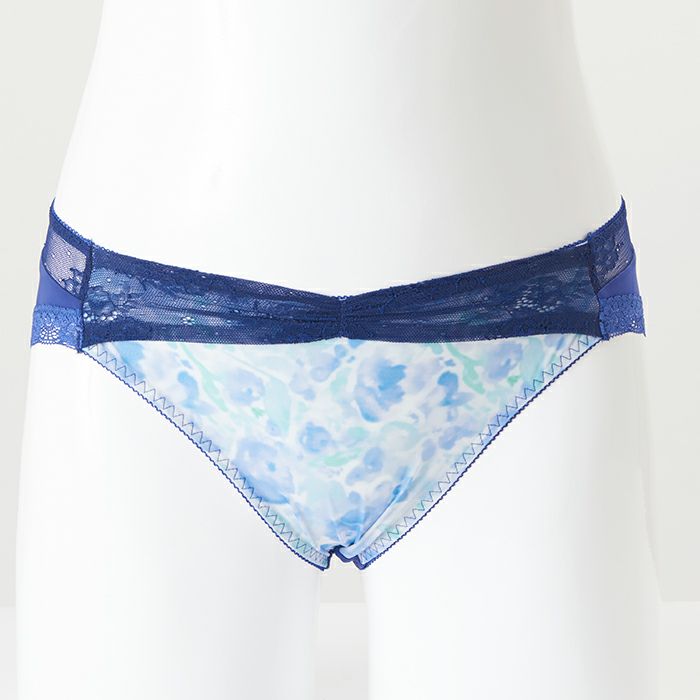 爽やかな水彩風プリントが魅力 大きいバストをしっかりと支え、バストを寄せて上げて脇もスッキリ、 サポート力の強い人気の「寄せ上げタイプ」のブラとお揃いのショーツ。 この季節にピッタリな爽やかなカラーのランジェリー。 前身には水彩画を想わせるプリント柄のチュールを重ねました。 ウエストにはダークネイビーのストレッチレースをあしらい、フロントギャザーのデザインがオシャレ感アップ。 後身は上辺をレース1枚仕様で切り替え、抜け感のあるスタイルに仕上げました。 アウターにひびきにくいように後足口には細幅レースを使用しています。 ※プリント柄は、商品によって柄の見え方が違う場合がございますため、ご了承ください。