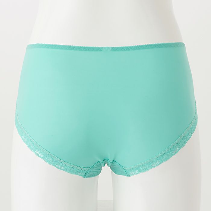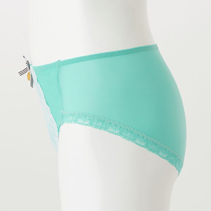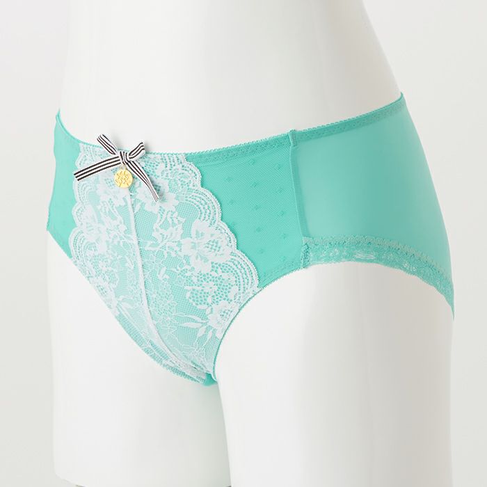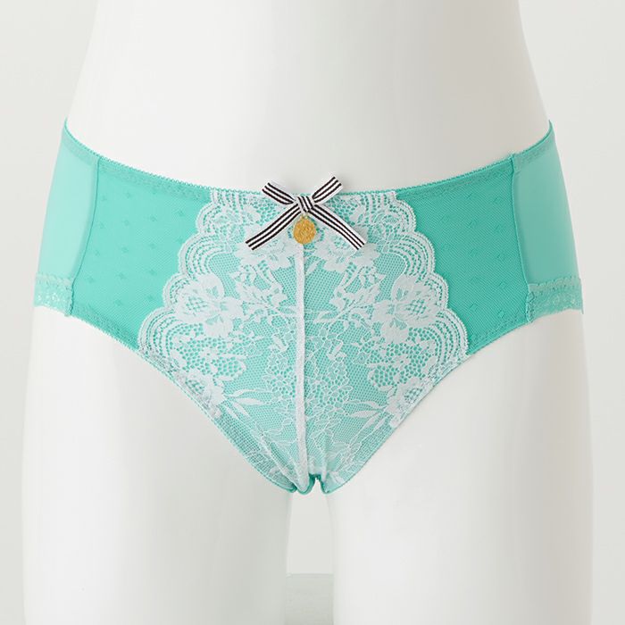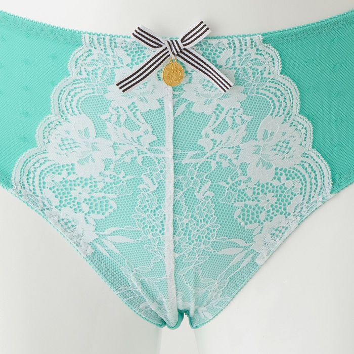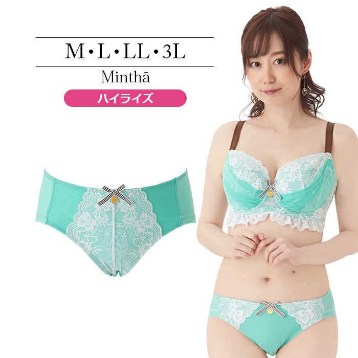 チョコミントをイメージした爽やかなデザイン 大きいバストをしっかりと支え、バストを寄せて上げて脇もスッキリ、 サポート力の強い人気の「寄せ上げタイプ」のブラとお揃いのハイライズ。 ミントグリーンにブラウンを差し色にした、チョコミントのようにフレッシュなカラーリング。 前身はホワイトのストレッチレースを重ね、サイドにはドット柄のチュール素材を切り替えました。 前中心にはストライプ柄のリボンとコイン型のモチーフを飾り、カジュアル感をプラスしました。 アウターにひびきにくいように後足口には細幅レースを使用しています。