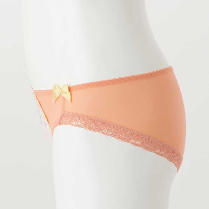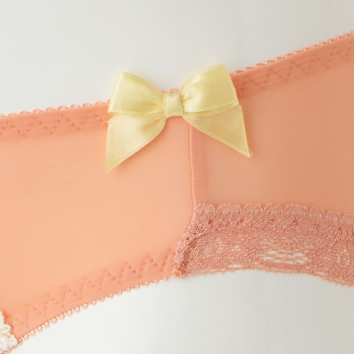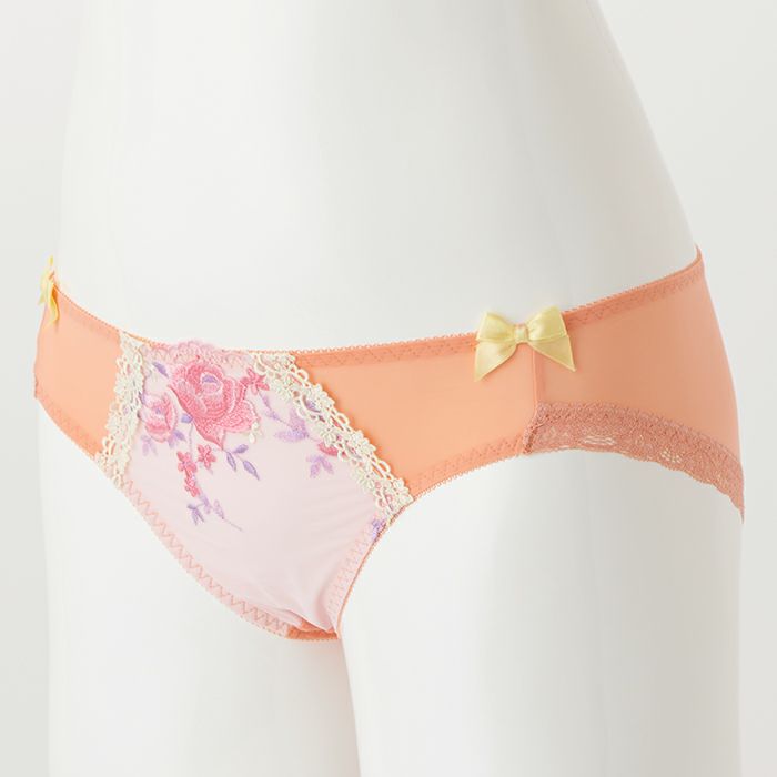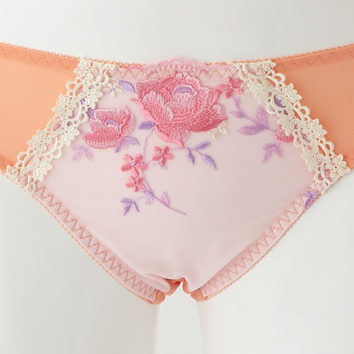 花柄の刺繍とケミカルレースがスイートな印象 大きいバストをしっかりと支え、バストを寄せて上げて脇もスッキリ、 サポート力の強い人気の「寄せ上げタイプ」のブラとお揃いのショーツ。 花柄の刺繍をあしらったフェミニンな印象のランジェリー。 前身はホワイトの裏打ちの上に、ピンクの刺繍糸を使用したエンブレースを重ねました。 ベースカラーはアプリコットでまとめ、前身の切り替えにはホワイトのケミカルレースを施しました。 両サイドにはイエローのサテンリボンを飾りました。 アウターにひびきにくいように後足口には細幅レースを使用しています。