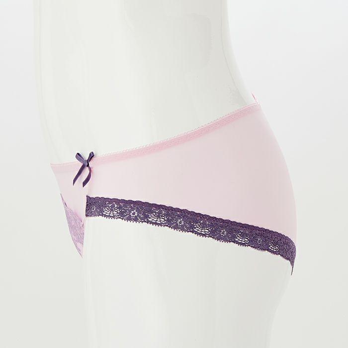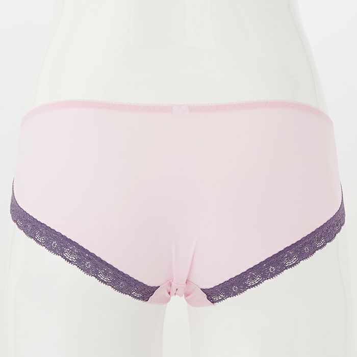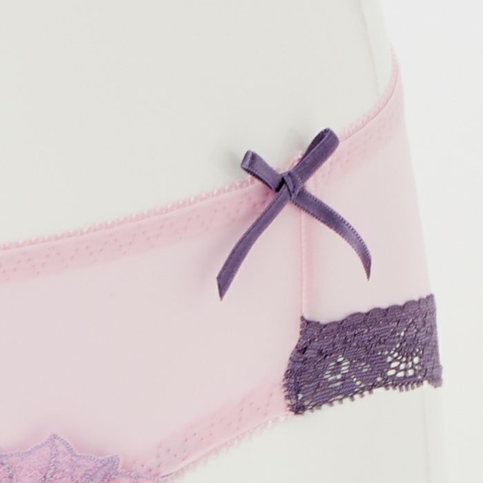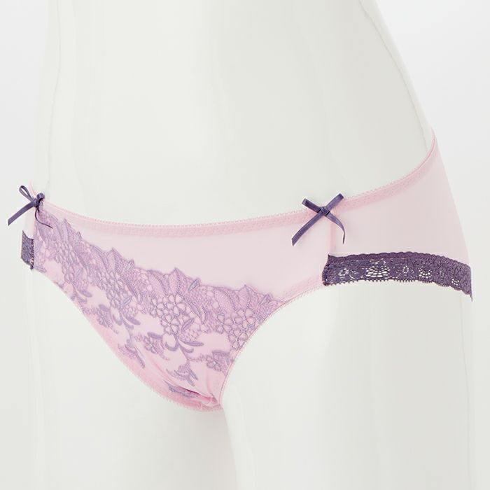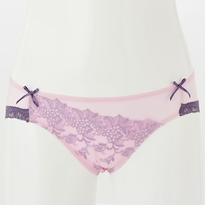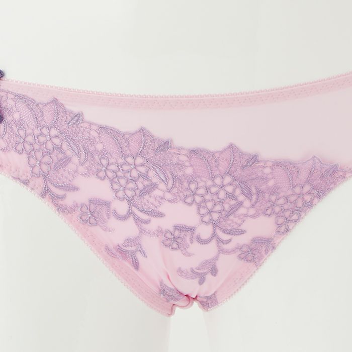 刺繍を贅沢に施したフェミニンなランジェリー バスト全体をしっかりカバーしながら持ち上げ効果も高い、 サポート力抜群のフルカップブラとお揃いのショーツ。 淡いピンクのカラーがフェミニンなランジェリー。 前身にはライラックカラーの刺繍レースをアシンメトリーに重ねました。贅沢に刺繍をたくさん施しているので、華やかな印象を与えます。 両サイドには大人っぽいローズグレーのサテンリボンを飾りました。 バックスタイルは足口にバイカラーのレースをあしらい、ふんわりとした色合いをスッキリと引き締めます。 アウターにひびきにくいように後足口には細幅レースを使用しています。
