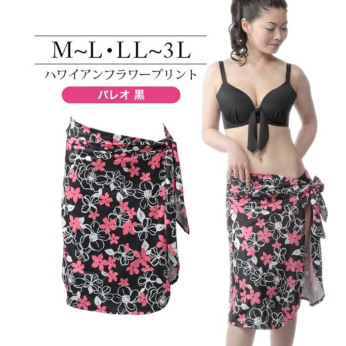 シンプルな水着もパレオでアレンジすれば、ワンランク違った着こなしに★ 1枚合わせるだけで、大人っぽくオシャレな印象を演出できます。 気になる部分を隠して体型カバーにもおすすめのアイテム♪ シンプルに腰巻きではお尻や太ももを隠しつつ、サイドから脚のラインをチラ見せすることで脚長効果も! ワンピーススタイルで首から結べば、スタイリッシュにコーデしつつお腹や腰回りを隠せます。 大人っぽいブラックをベースに、夏らしいカジュアル感のある花柄の光沢プリント。2Wayトリコット素材で伸びがよく、サラッとした手触りです。 程よい厚みがあるので、薄いパレオでは透け感が気になる人にもおすすめです。 (モデル)身長160cm ヒップ86cm/着用サイズ M~L