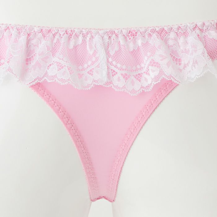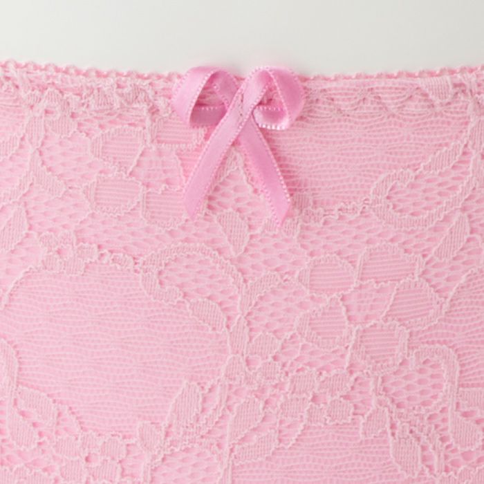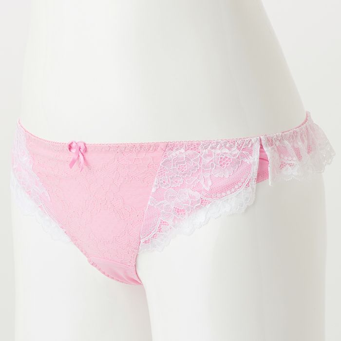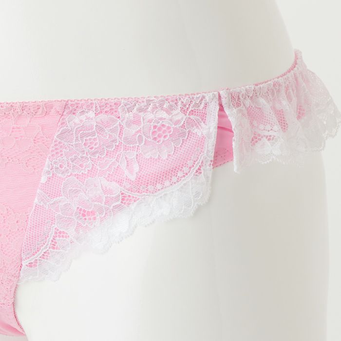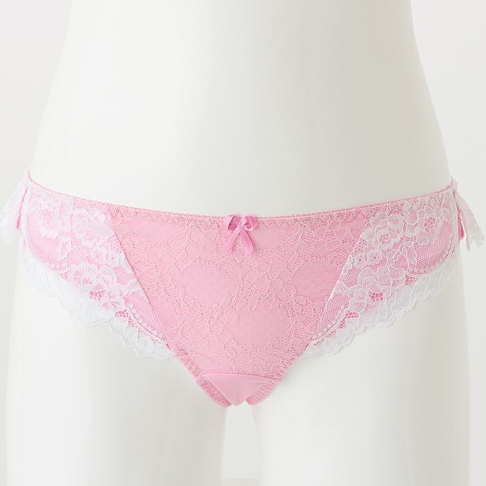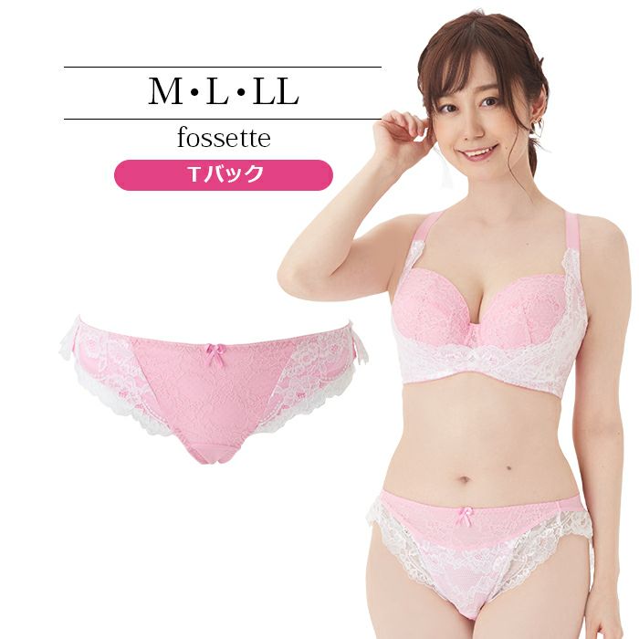 バストをリフトアップ&姿勢を正すバッククロス 大きいバストをしっかりと支え、バストを寄せて上げて脇もスッキリ、 サポート力の強い人気の「寄せ上げタイプ」のブラとお揃いのTバック。 ピンクとホワイトのレースデザインがガーリーな印象のランジェリー。 前身は凹凸の少ない広幅レースを重ね、サイドはハート柄のスカラが可愛らしいストレッチレースを切り替えました。 前中心には繊細なサテンリボンを飾りました。 後身はレースフリルを施しフェミニンに仕上げました。