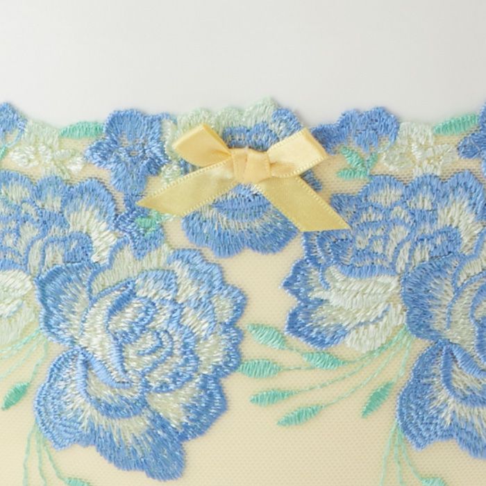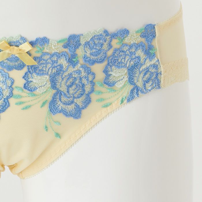 ソフトなクリーム色にブルーの花柄が映える 大きな胸の谷間をより美しく魅せる、前中心の低い谷間タイプのブラとお揃いのショーツ。 華やかな刺繍をふんだんに施したエレガントな印象のランジェリー。 柔らかいクリーム色をベースカラーに、前身にはブルーの花柄が爽やかかつ鮮やかな刺繍レースを重ねました。 前中心にはイエローのサテンリボンを飾りました。 アウターにひびきにくいように後足口には細幅レースを使用しています。