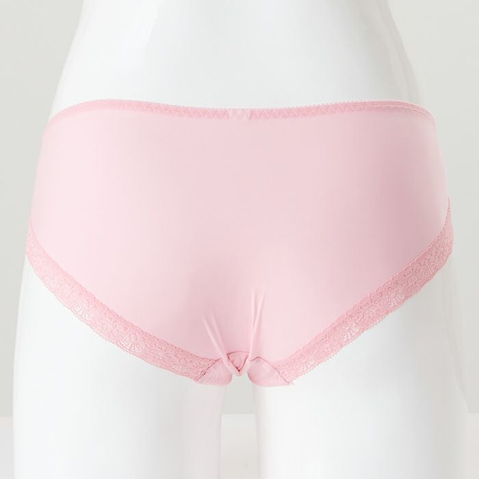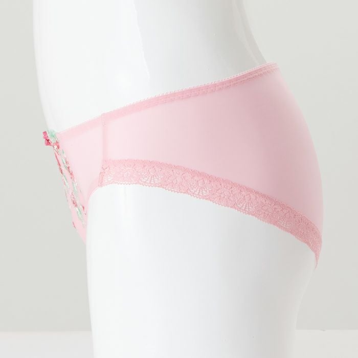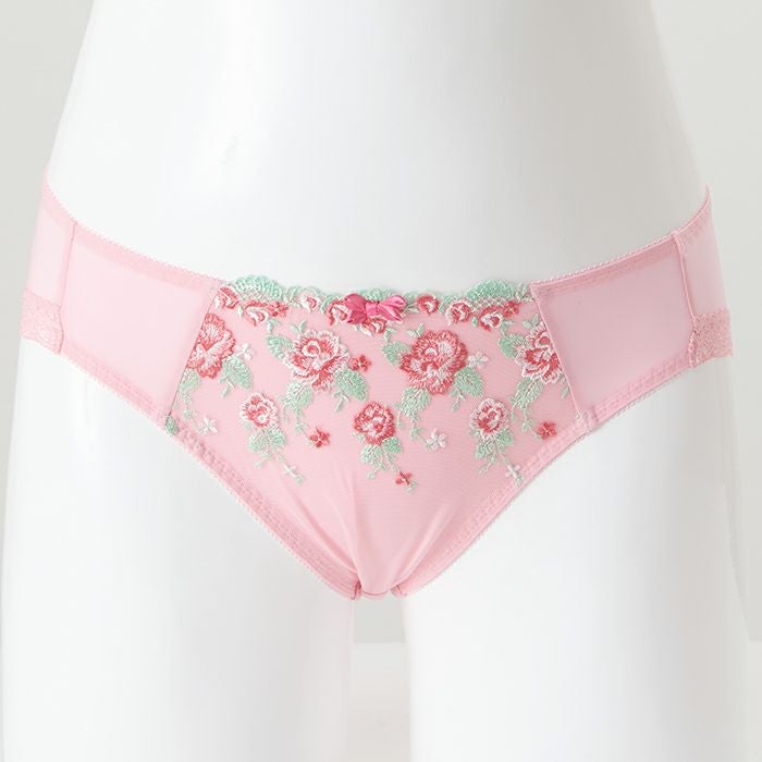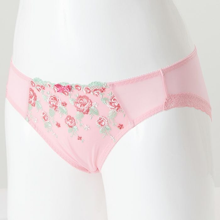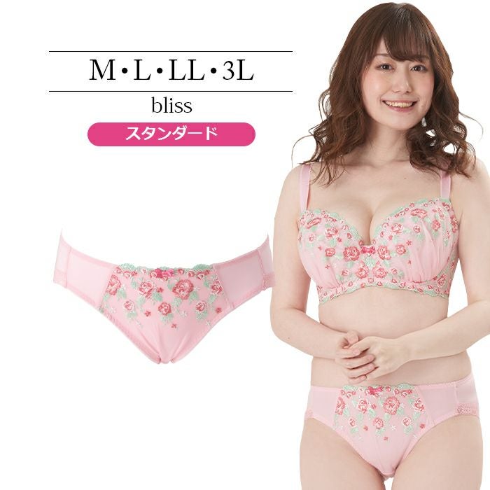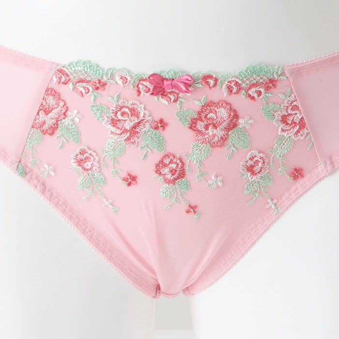 ピンク×花柄がとってもキュート 大きいバストをしっかりと支え、バストを寄せて上げて脇もスッキリ、 サポート力の強い人気の「寄せ上げタイプ」のブラとお揃いのショーツ。 定番のピンク×花柄は女性がときめくスイートなデザイン。 前身はベリーのような色づかいが可愛い花柄のエンブレースを重ねました。 刺繍が華やかなので、無地ピンクと切り替えてシンプルに仕上げています。 前中心には小ぶりのサテンリボンを飾りました。 アウターにひびきにくいように後足口には細幅レースを使用しています。