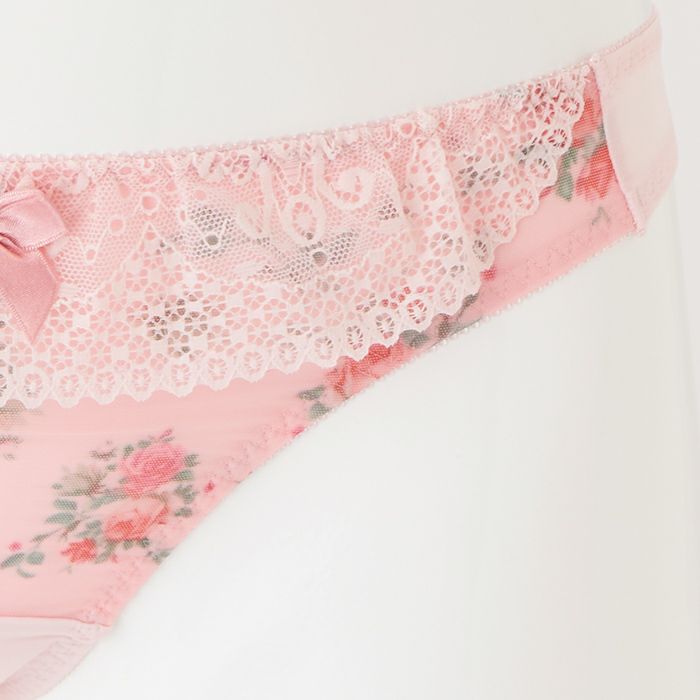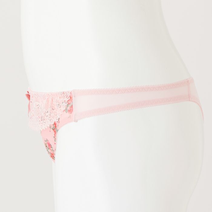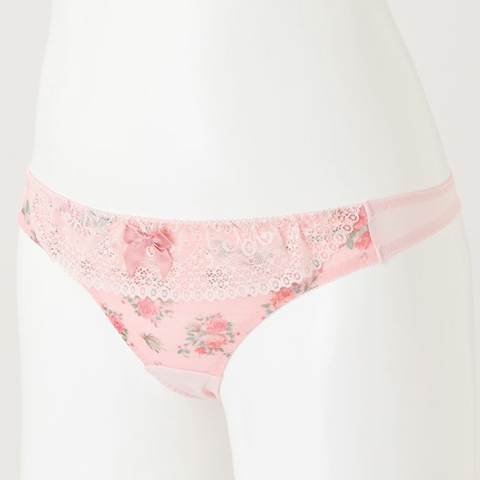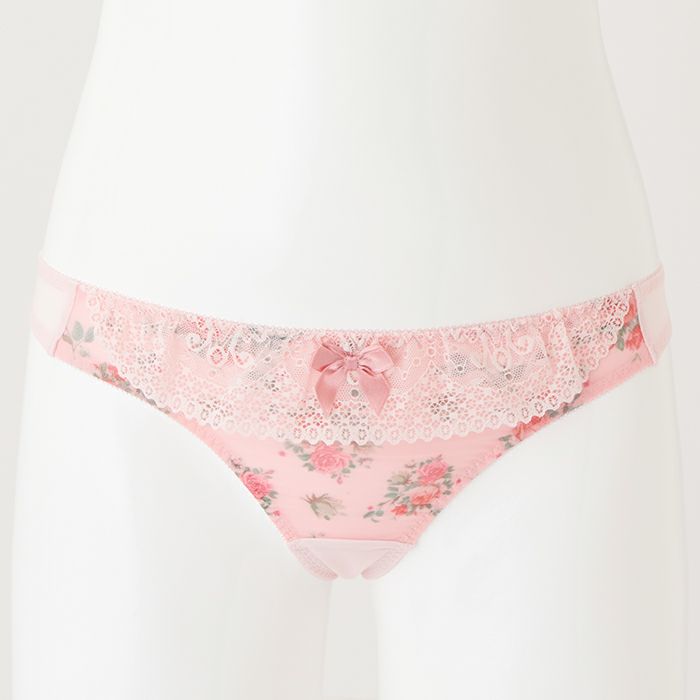 乙女心をくすぐるローズプリント バストの存在感を目立たせず、自然な丸みを表現する 「丸胸タイプ」のブラとお揃いのTバック。 ピンク×ローズ柄が乙女心をくすぐるデザイン。 前身はローズ柄のチュールプリントを重ねました。 上辺にはベビーピンクのストレッチレースを施し、スイートな印象に仕上げました。 前中心にはローズレッドのサテンリボンを飾りました。 ※プリント柄は、商品によって柄の見え方が違う場合がございますため、ご了承ください。