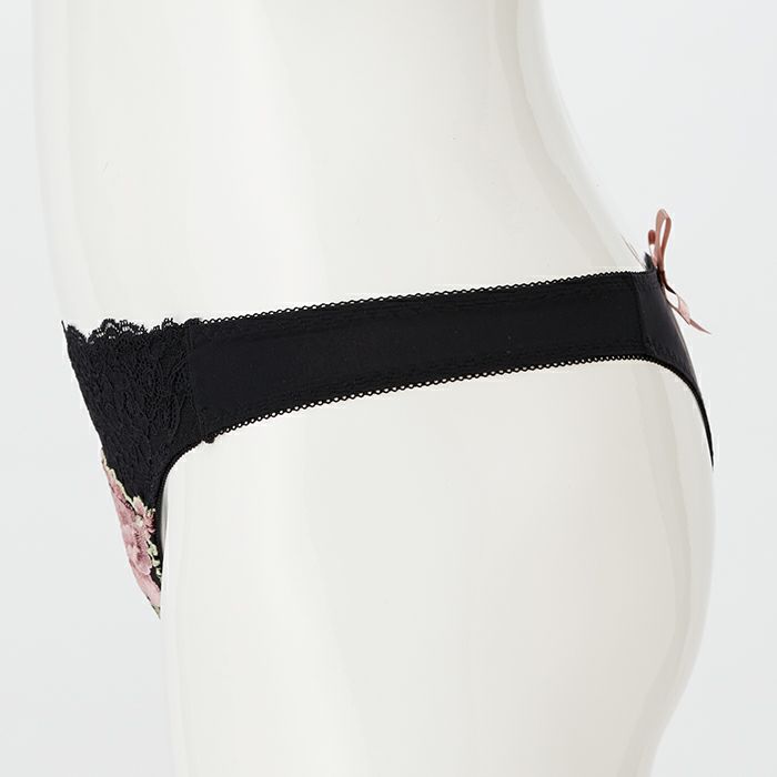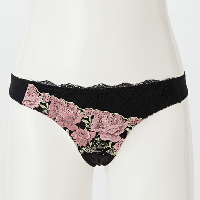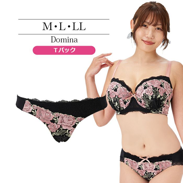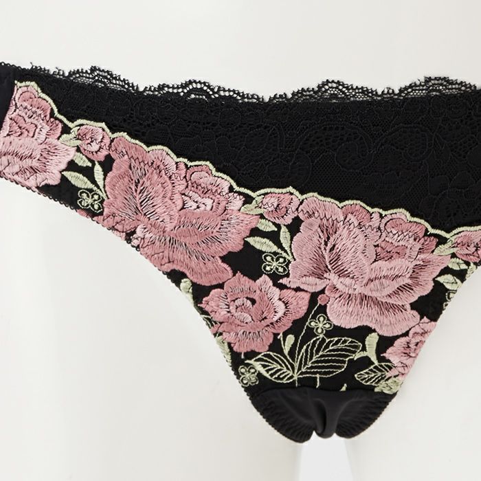 美しい薔薇模様が一際目を引くランジェリー 大きいバストをしっかりと支え、バストを寄せて上げて脇もスッキリ、 サポート力の強い人気の「寄せ上げタイプ」のブラとお揃いのTバック。 ブラックのベースに施した薔薇模様の刺繍が際立つランジェリー。 前身には美しい薔薇の刺繍レースを重ね、上辺にブラックのストレッチレースをアシンメトリーに組み合わせました。 後中心には大きめのサテンリボンを飾り華やかに仕上げました。 オールドローズのようなピンク色なので、派手になりすぎずエレガントな印象に着こなせます。