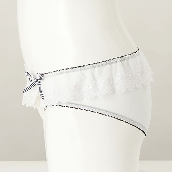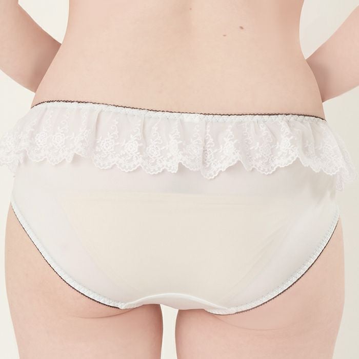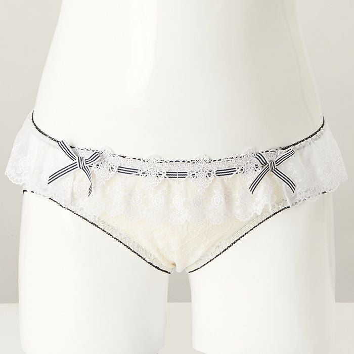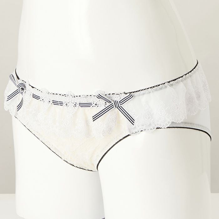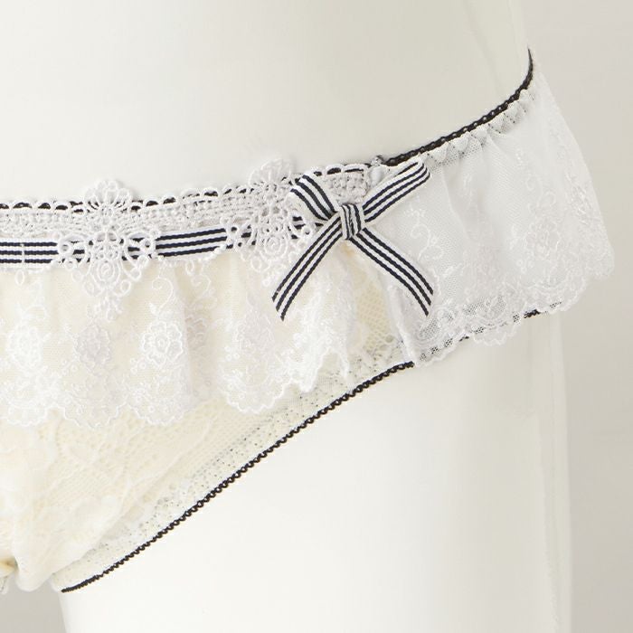 レースをふんだんに使用した贅沢なデザイン 大きいバストをしっかりと支え、バストを寄せて上げて脇もスッキリ、 サポート力の強い人気の「寄せ上げタイプ」のブラとお揃いのショーツ。 レースをふんだんに使用した、ドレスのように美しいランジェリー。 前身にはホワイトのストレッチレースを重ね、裏打ちをクリーム色にすることで花模様を立体的に表現します。 ウエストフリルに繊細なレースをあしらい、さらに前身の上辺にはケミカルレースを重ねたリッチな組み合わせ。 内側のゴムはブラックにまとめ、ストライプのリボンを前身上辺と両サイドに飾り、フェミニンな中にカジュアル感も演出しました。