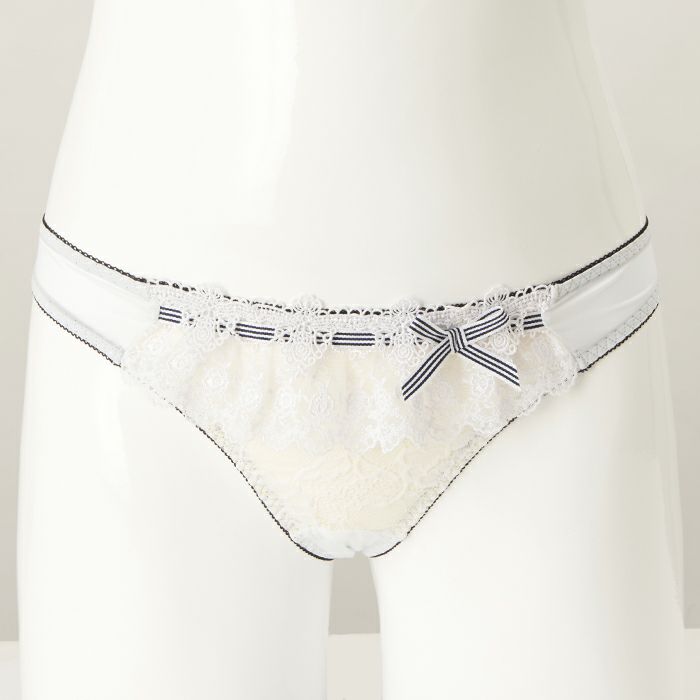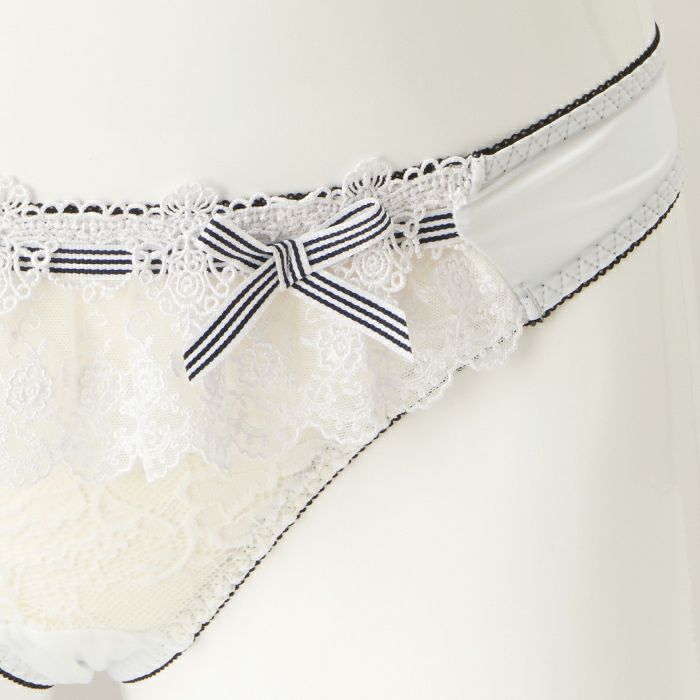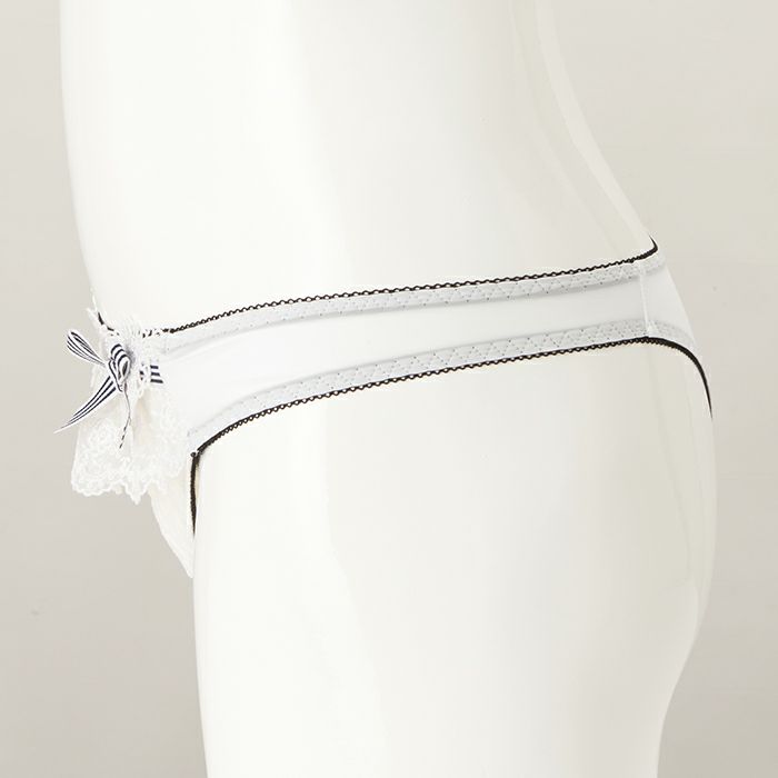内側のゴムはブラックにまとめ、ストライプのリボンを前身の上辺とサイドに飾り、フェミニンな中にカジュアル感も演出しました。