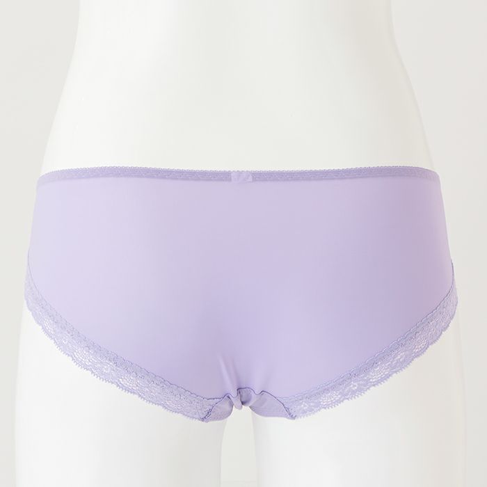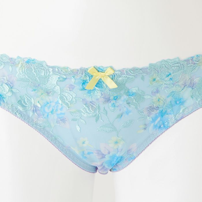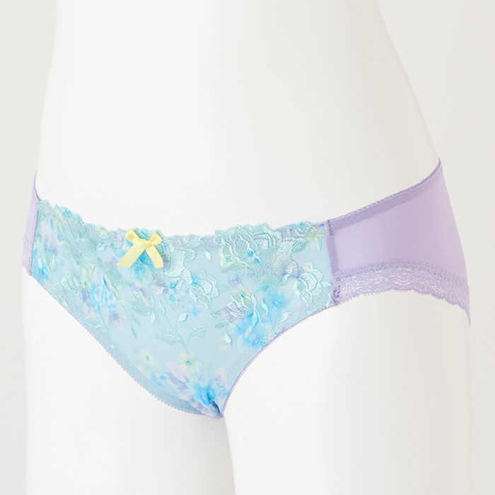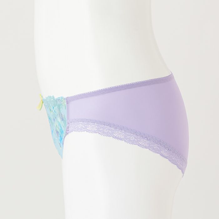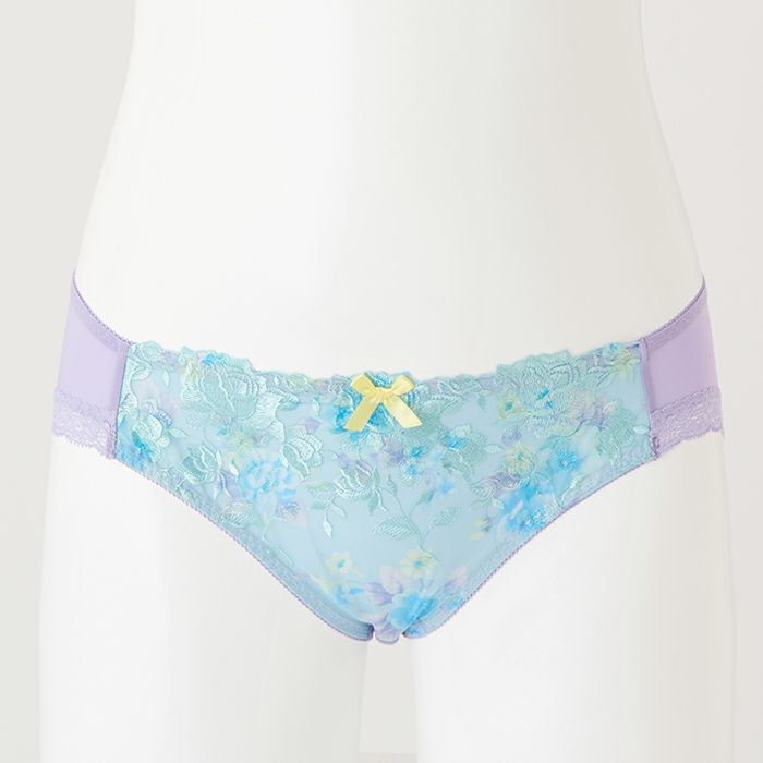 淡いプリント柄と水色の刺繍糸が爽やかな印象 アウターに響きにくいシームレスタイプ&バストをからだに密着させ小さく見せる「モールドブラ丸胸タイプ」とお揃いのショーツ。 爽やかなカラーリングのプリントと刺繍が印象的なランジェリー。 前身には淡いプリントのチュール素材に水色の花模様をあしらった刺繍レースを重ねました。 ブルー系のレースとラベンダーのベースカラーの組み合わせで、スッキリと魅せつつフェミニンなデザインにまとめました。 前中心にはイエローのサテンリボンを飾りました。 アウターにひびきにくいように後足口には細幅レースを使用しています。 ※プリント柄は、商品によって柄の見え方が違う場合がございますため、ご了承ください。