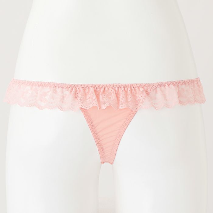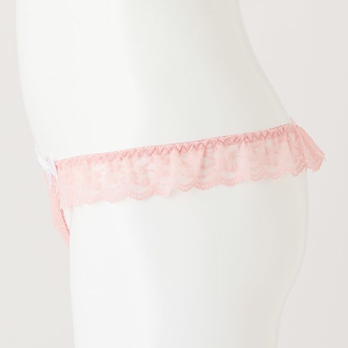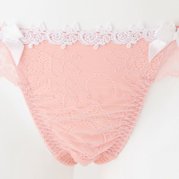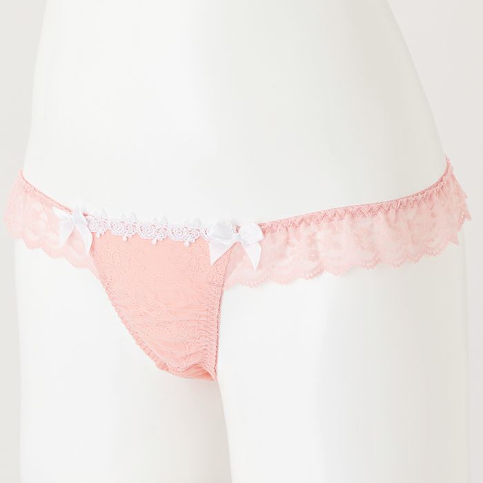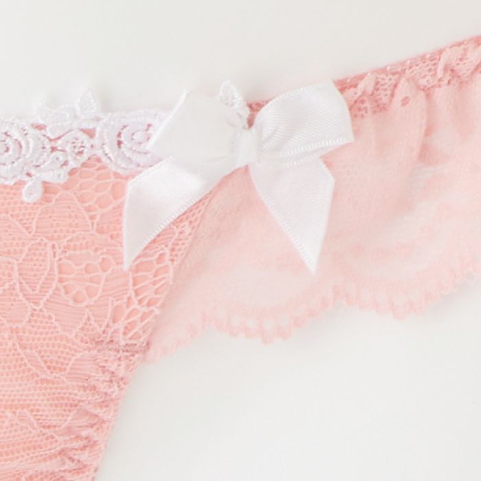 ピンクのレースフリルがSweetなランジェリー 大きいバストをしっかりと支え、バストを寄せて上げて脇もスッキリ、 サポート力の強い人気の「寄せ上げタイプ」のブラとお揃いのTバック。 パステルピンクのレースデザインがスイートな印象のランジェリー。 前身には広幅のレースを重ね、サイドからバックにはストレッチレースのフリルをあしらいました。 さらに前身の上辺にホワイトのケミカルレースを乗せ、サテンリボンを2つ飾りロマンティックに仕上げました。