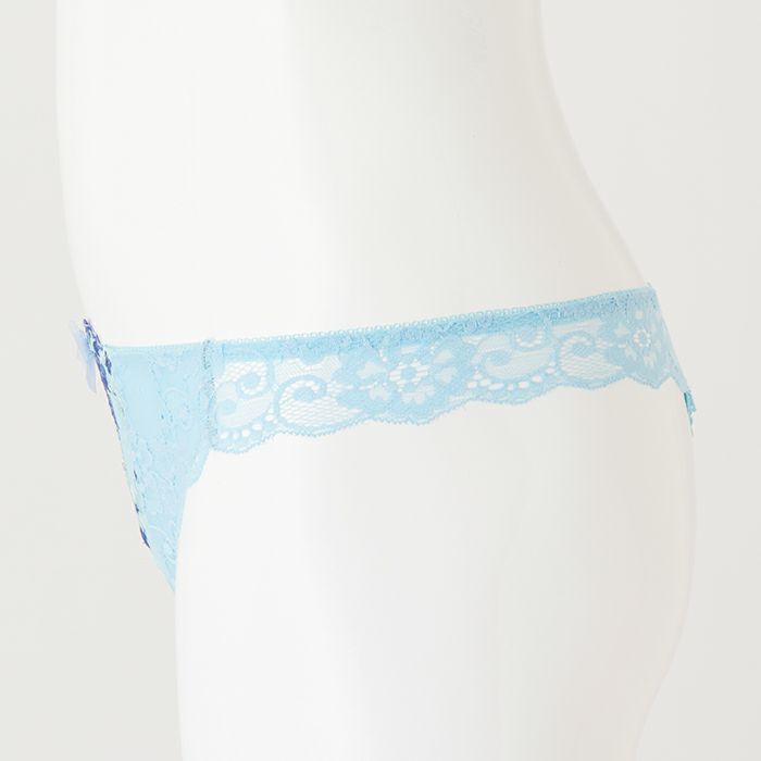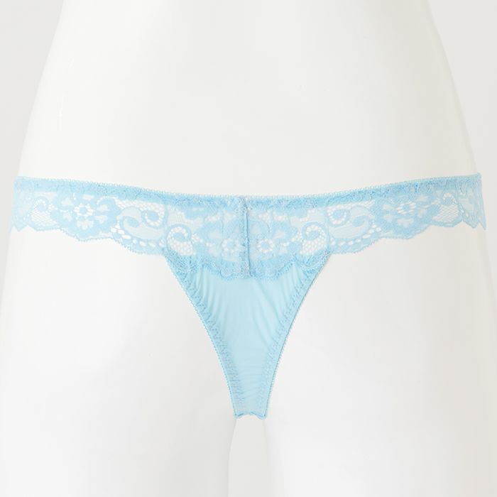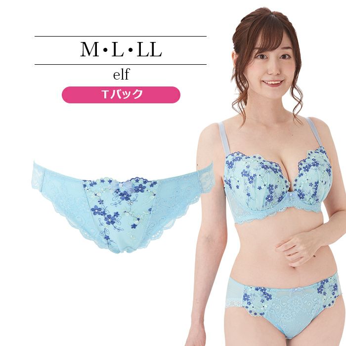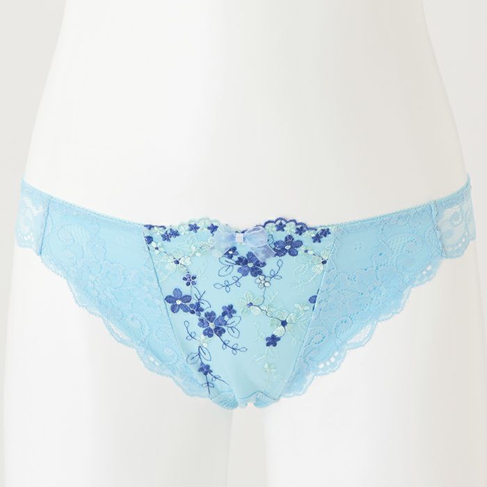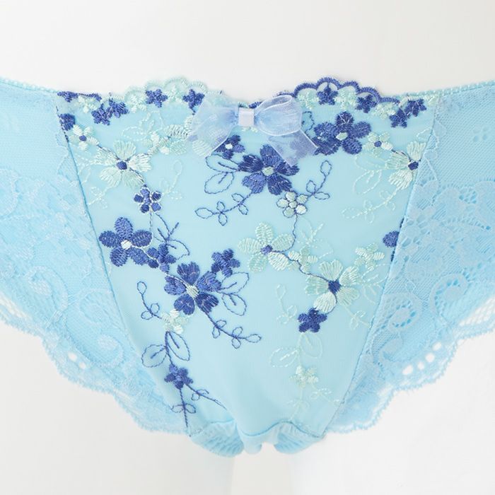 青い小花を散りばめたフレッシュなデザイン 大きな胸の谷間をより美しく魅せる、前中心の低い谷間タイプのブラとお揃いのTバック。 フレッシュなカラーでまとめた清楚な印象のランジェリー。 前身にはブルーが映える小花柄の刺繍レースを重ね、サイドには水色のストレッチレースを使用しました。 前中心にはオーガンジーリボンを飾りました。 サイドから後身の上辺はストレッチレース1枚仕様でスッキリと仕上げました。 デイリーからオシャレな気分の日まで使いやすく、飽きのこないデザインです。