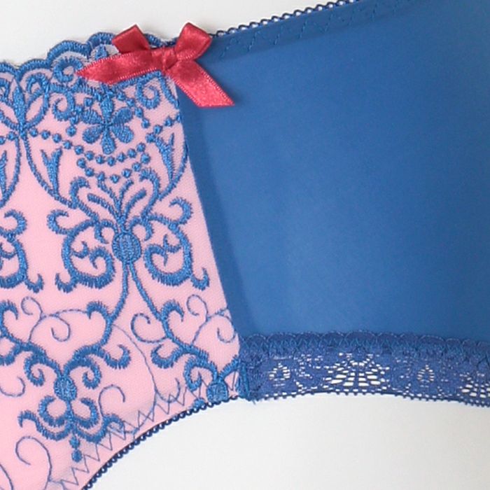 フロントは淡いピンクをベースにしているので、ブルーの刺しゅうが映えるスタイリッシュなデザイン。