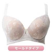 モールドブラは試してみたかったのですが、無地のデザインはあまり好きではないので清楚なレースのこちらを購入しました。 ブラだけ着用した状態だとそうは見えないのですが、服を着た状態だと寄せ上げよりもバストトップ位置が上がって見えます。 Jカップなので「バストを小さく魅せる4/5カップ着やせブラ」の効果はあまり感じられないのですが、寄せ上げや丸胸よりも前中心に胸が強く寄せられ、極端に表現すると普通のブラは二つ山だけどモールドブラは一つ山を作るという感じです。 とにかく中央に寄せられるので脇はスッキリすると思います。 丸胸や寄せ上げブラと同じJ70を選んだのですが、前中心に胸が強く寄せられ胸の谷間がべったりくっ付きます。サイズが小さいのかなと思いますが、J75はバージスラインが広すぎて合わなそうなのでK70が出たら是非再購入したいです。いつかKカップも販売してください。 -